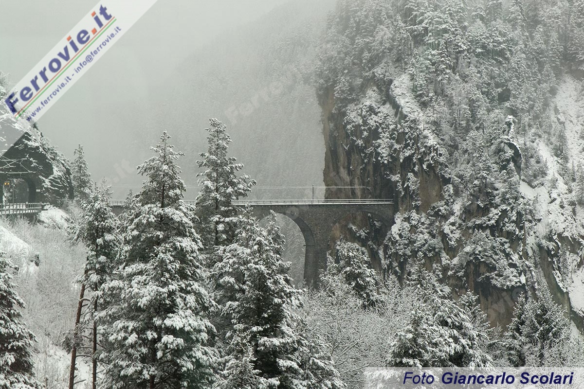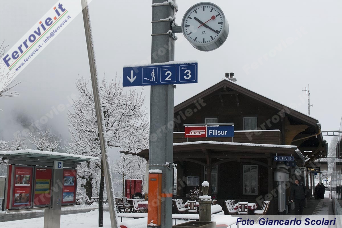 Sempre sotto la neve arriviamo a Filisur, dove incontriamo la linea proveniente da Davos. Sono le 10.17 e siamo in viaggio da 62 minuti, un'ora in cui abbiamo incontrato paesaggi da favola, ardite opere di ingegneria e una natura incontaminata, e mancano ancora 7 ore di viaggio.