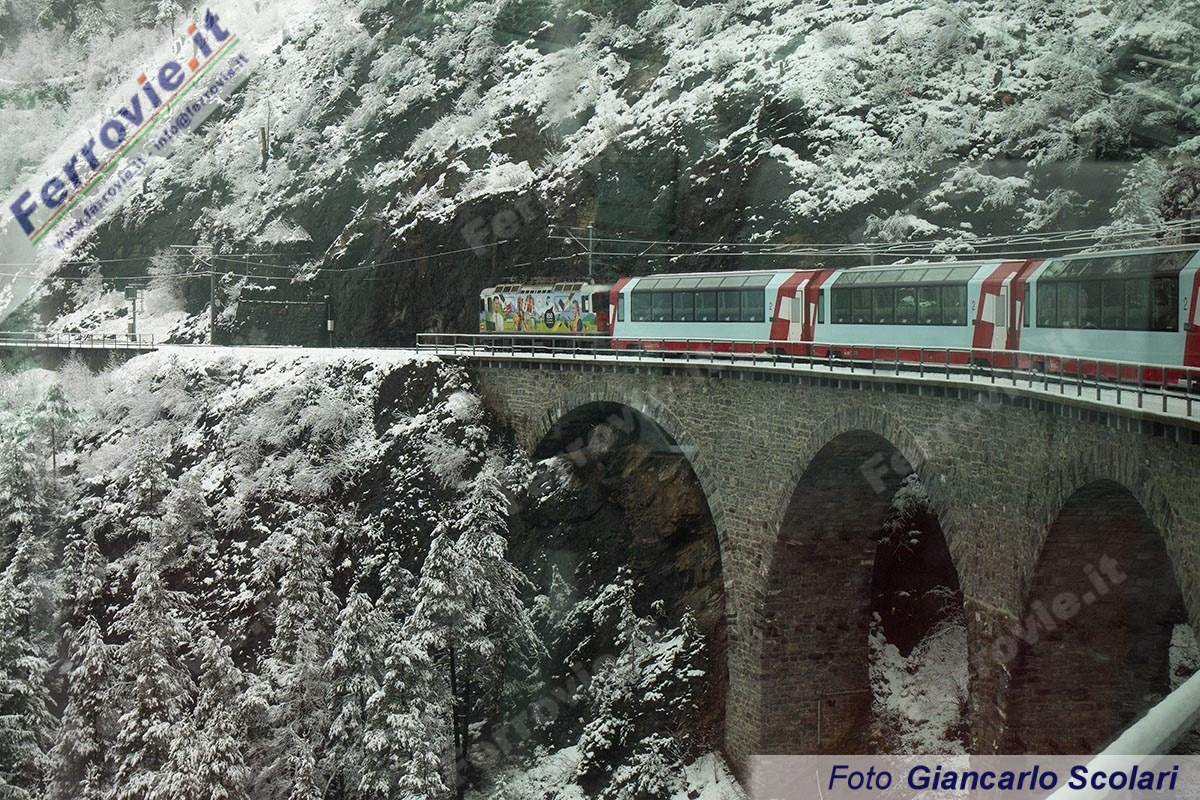 Lasciata alla nostra destra la linea per Davos, troviamo uno dei punti più famosi della Ferrovia Retica e simbolo del Glacier Express: il viadotto di Landwasser. E' il più lungo e alto viadotto che incontra il Glacier Express con i suoi 142 metri di lunghezza e 65 di altezza. La struttura è retta da cinque pilastri in muratura e descrive un quarto di cerchio con un raggio di 100 metri prima di finire all'ingresso del tunnel di Landwasser.