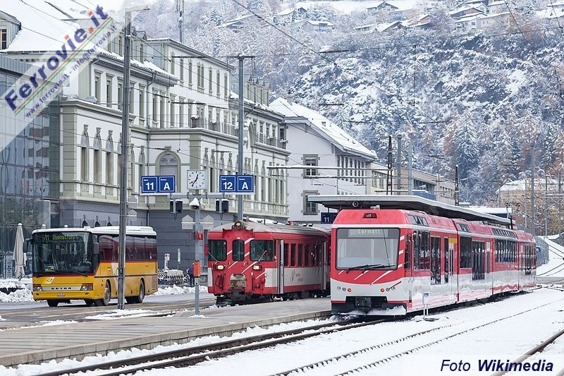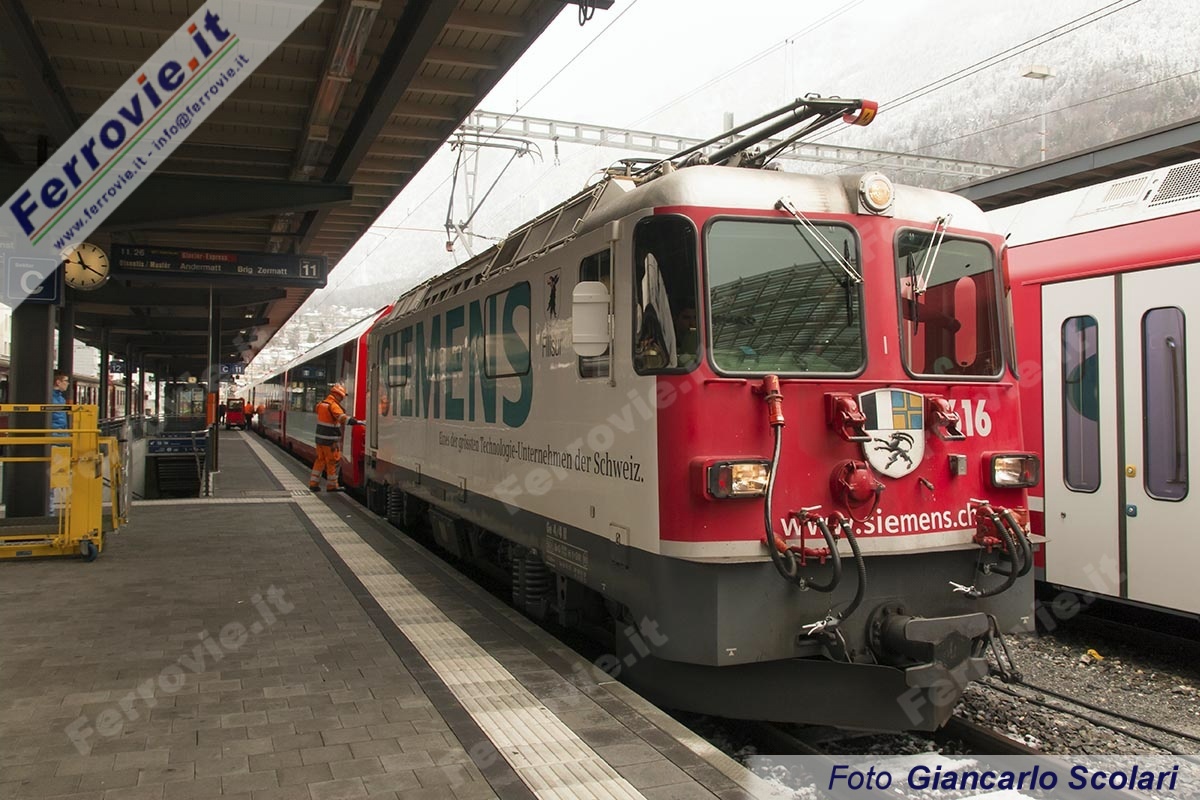 Il sole scende dietro le montagne alle spalle di Briga, il giorno volge al termine. L'imponente scalo merci ci preannuncia l'arrivo a Briga, importante nodo di scambio tra la linea MBG, e quelle FFS della valle del Rodano verso Losanna e Ginevra, del Sempione verso Domodossola e del Lötschberg verso Spiez e Berna. Quest'ultima ha perso la sua importanza con l'apertura da Visp del tunnel di base del Lötschberg, lungo 34,6 chilometri. A Briga il Glacier Express attraversa il piazzale antistante la stazione FFS prima di effettuare la fermata nella stazione MGB di Brig Bahnhofplatz.