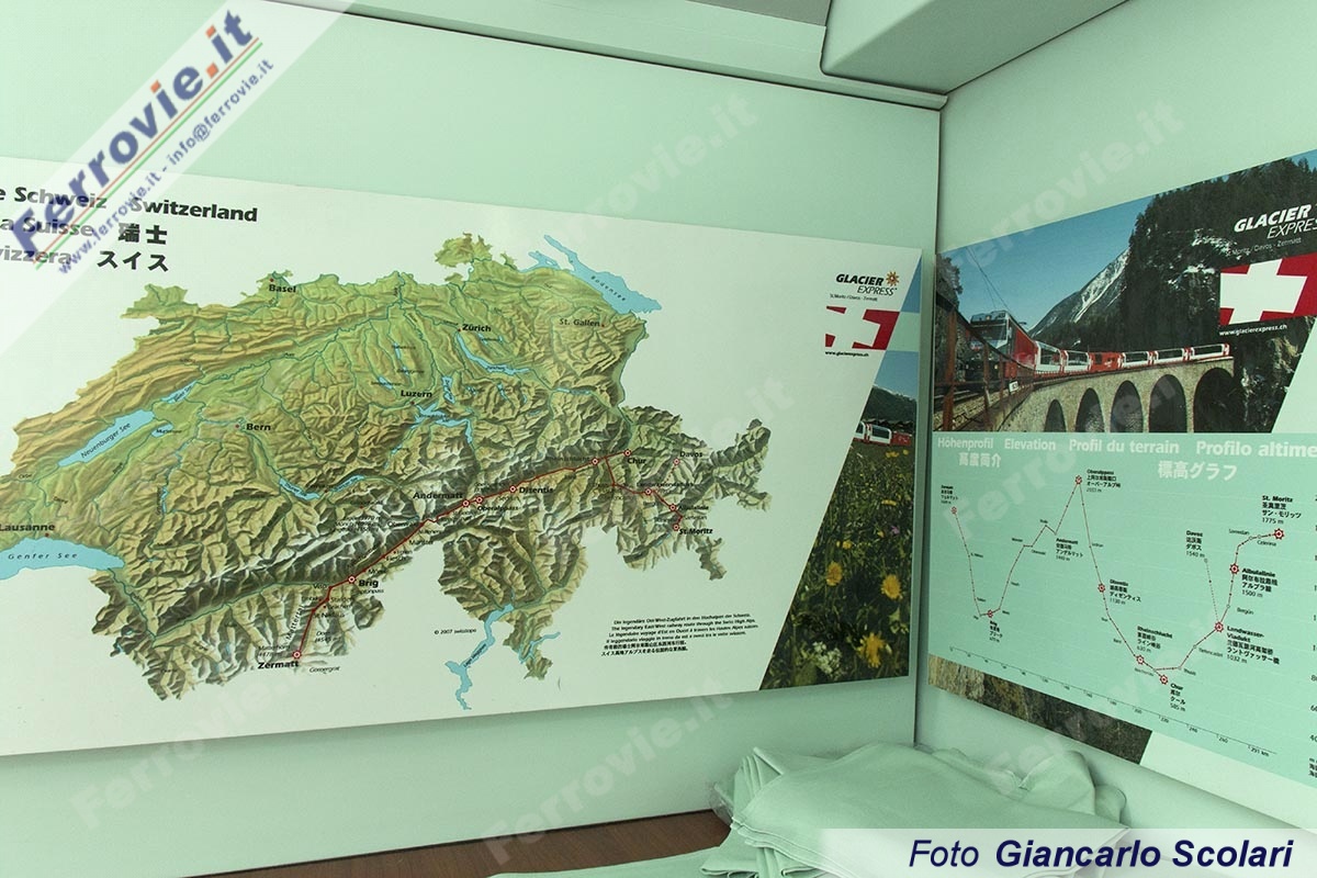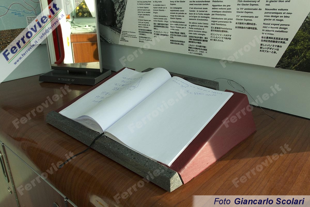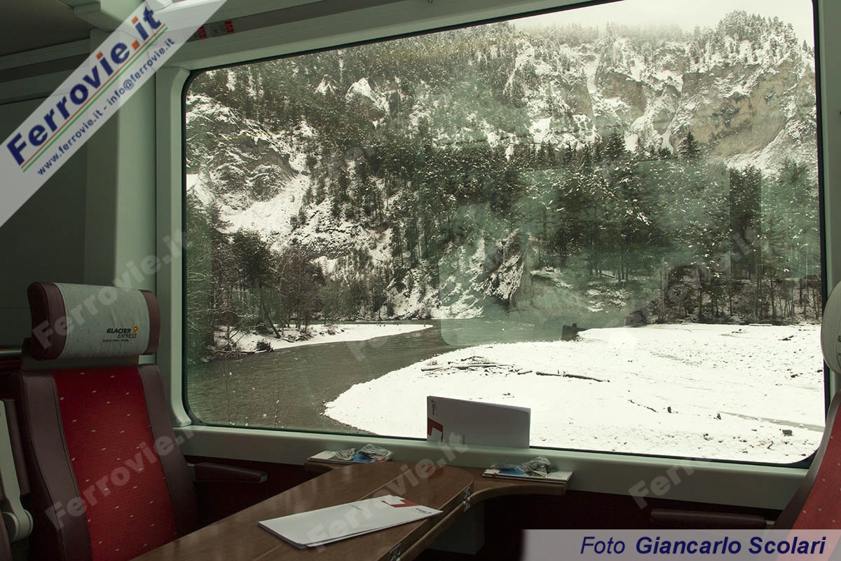 Saliamo a bordo, anche oggi siamo posizionati nella vettura 21, quella di testa dopo il cambio banco di Coira. Il personale ha appena tolto dai tavoli i resti del pranzo e anche oggi la vettura è piena a metà. Sono circa duecentomila i passeggeri che ogni anno viaggiano sul Glacier Express, il 25% viene dalla Germania, il 25% è asiatico, il 20% svizzero. In numero minore gli inglesi e gli italiani. Partiti in orario da Andermatt alle 13.54, 100 metri dopo la stazione superiamo, per mezzo di un ponte metallico, il torrente che attraversa il paese: proprio sotto questo ponte, a circa 300 metri di profondità, passa il traforo storico del San Gottardo.