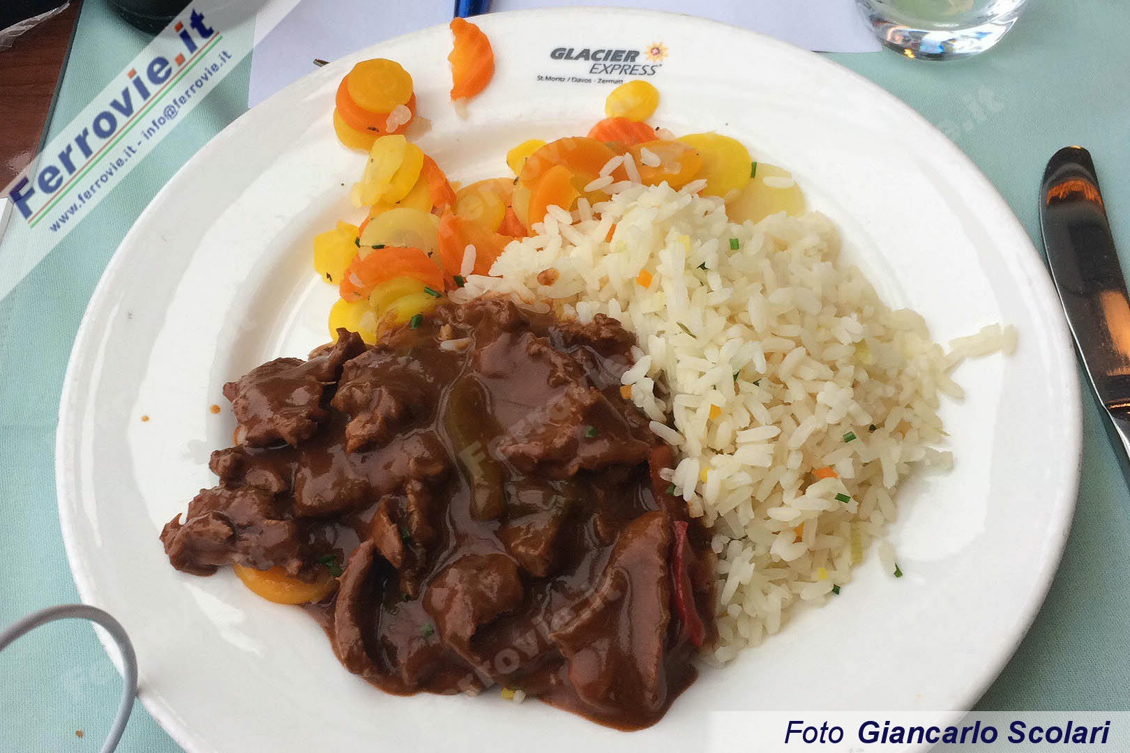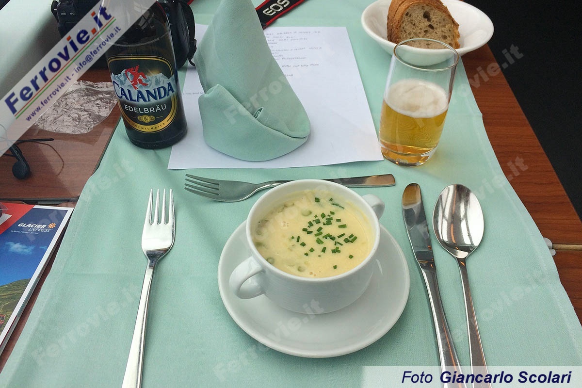 Intorno alle 12 vengono apparecchiati i tavoli e inizia il servizio del pranzo. Il menu era stato ordinato al personale del treno poco dopo la partenza da St. Moritz. La nostra scelta è caduta sul menu 8, che prevede zuppa di cardi e patate come entrée, gulasch con riso e verdure come piatto principale e tiramisù per dessert. Il tutto accompagnato dalla tipica birra dei Grigioni, la Calanda.
