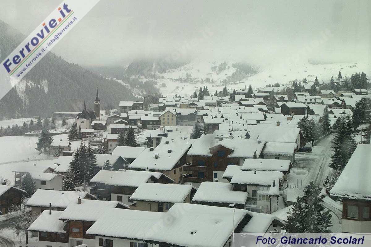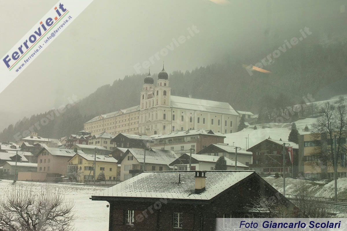 La neve, che abbiamo ritrovato nelle gole del Reno, cade sempre più forte. Pranzare seduti al proprio posto mentre dagli ampi finestrini possiamo ammirare il paesaggio della Svizzera centrale sotto la neve ci fa sembrare di stare in un sogno. La nostra vettura è piena per un 50%, molto più affollata la prima classe. Arriviamo così a Disentis/Mustér, dove inizia la tratta gestita dalla Matterhorn Gotthard Bahn. Disentis è il nome in tedesco mentre Mustér è quello in romancio. Qui vive la comunità di lingua romancia più grande della Svizzera. Il paese di poco meno di tremila abitanti è famoso per la sua imponente abbazia benedettina.
