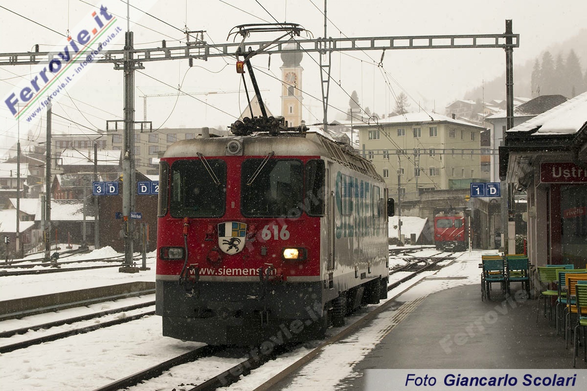 Alle 11.17 giungiamo a Coira, che con i suoi cinquemila anni di storia è la più antica città della Svizzera. La stazione, in comune tra FFS e RhB, presenta binari con lo scartamento ordinario e altri a scartamento metrico. A Coira approdano praticamente tutti i mezzi a lunga percorrenza delle FFS: ICN, IC a doppio piano IC 2000 e IR e IC oltre agli ICE provenienti dalla Germania. Per il Glacier Express c'è il cambio macchina. Fino a Disentis/Muster saremo trainati dalla RhB Ge 4/4 II numero 616 in livrea Siemens.