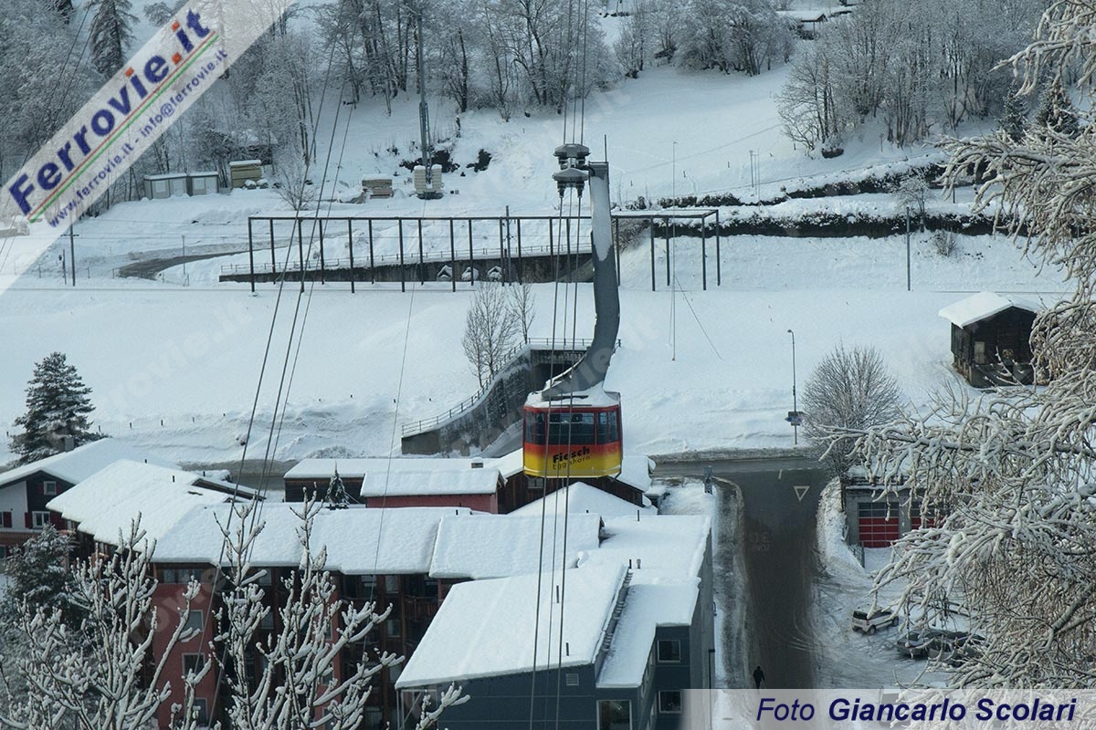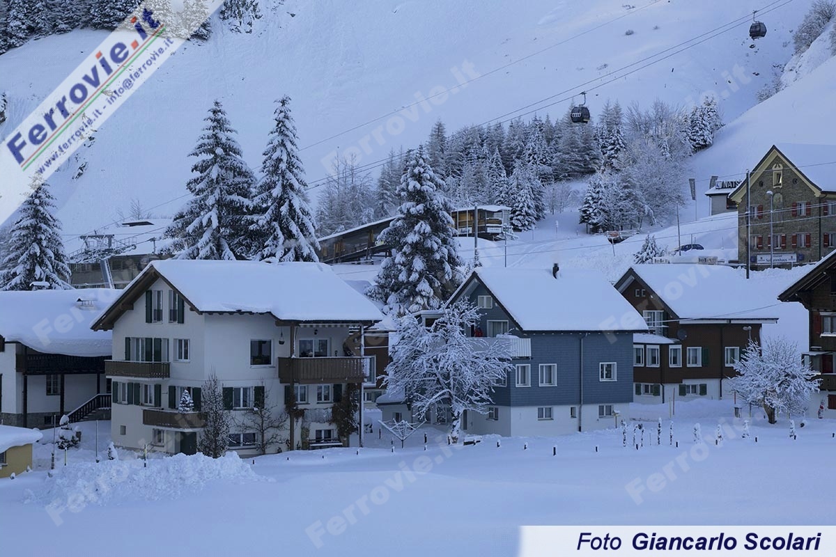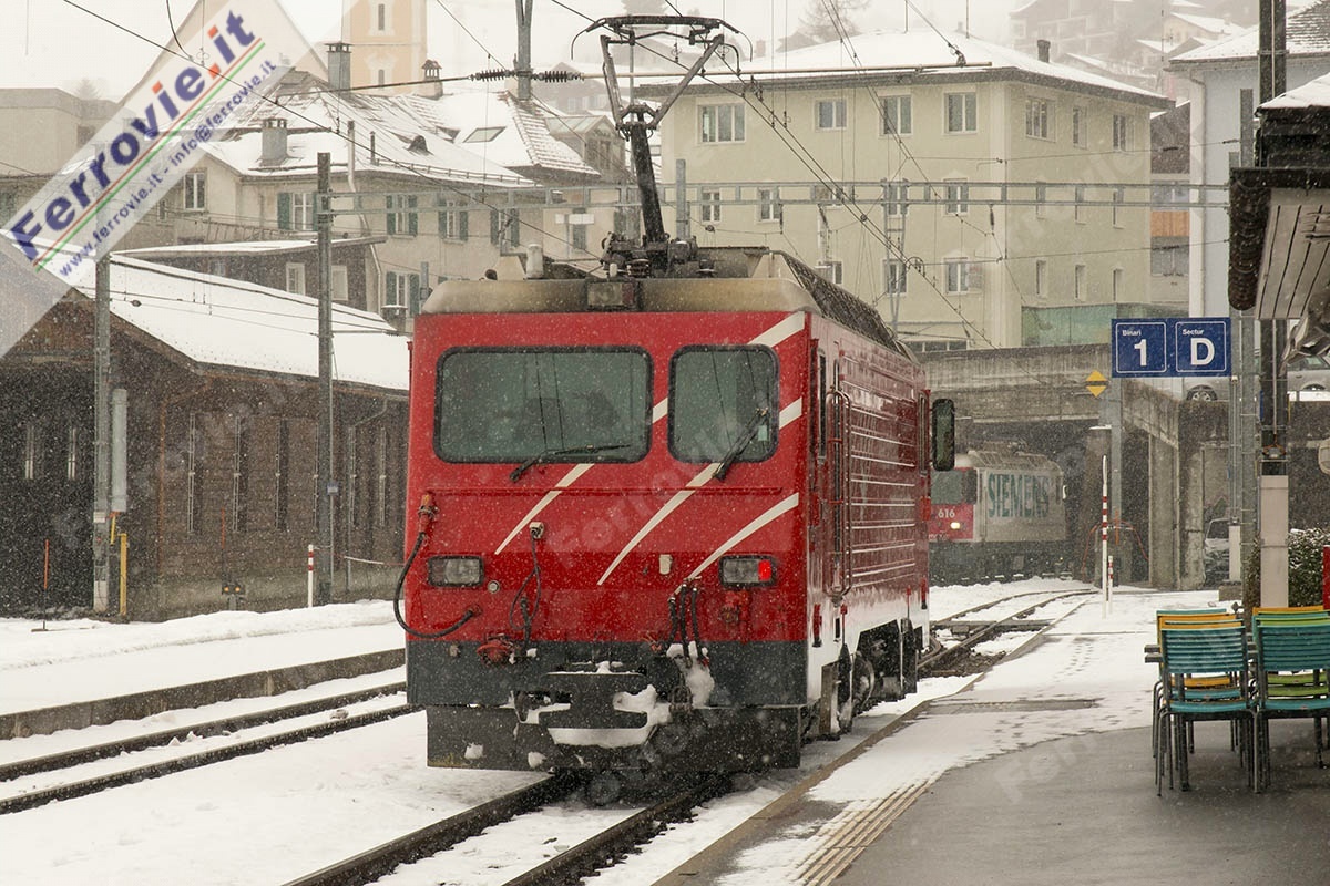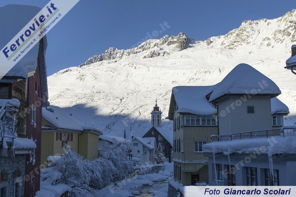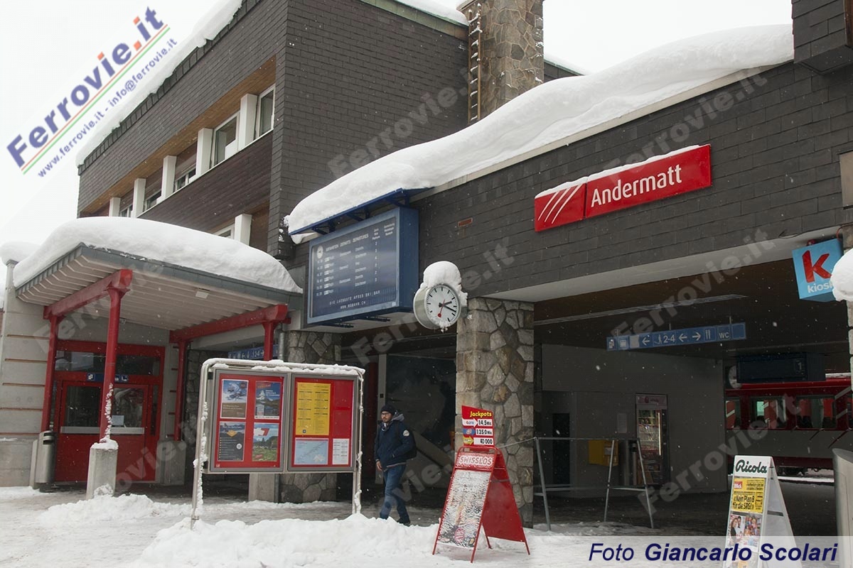 Ne approfittiamo per un giro turistico della città, in attesa di riprendere il Glacier Express alle 13.54. Mentre attendiamo il treno, almeno due persone cercano il modo di raggiungere Sedrun o il Vallese in auto: un incidente nella galleria autostradale del San Gottardo ha causato la chiusura del tunnel almeno fino alle 18. Le nuvole fanno nuovamente la propria comparsa mentre cominciano timidamente a cadere i primi fiocchi di neve. Dal marciapiede del binario 2 della stazione di Andermatt riusciamo a vedere in tre diversi punti il nostro Glacier Express mentre scende dal passo Oberalp; la discesa al 110 per mille termina proprio all'ingresso della stazione.