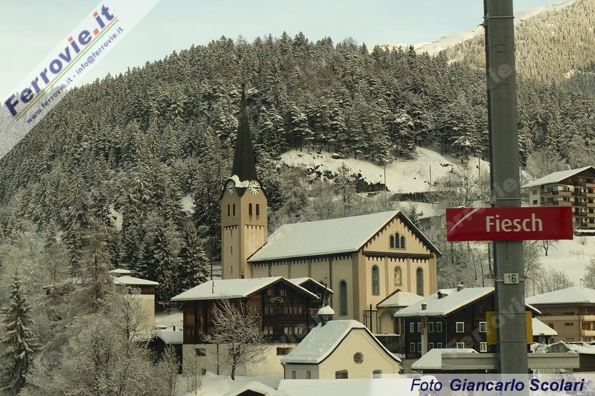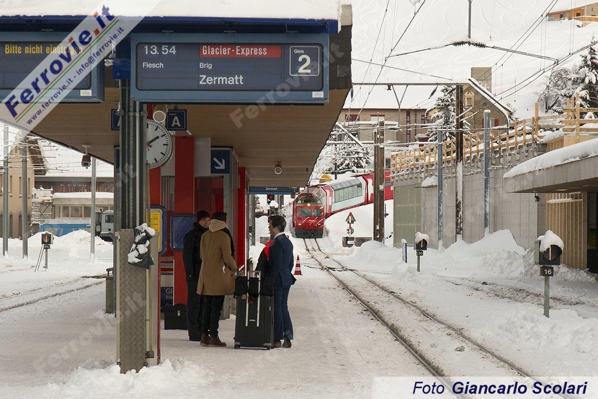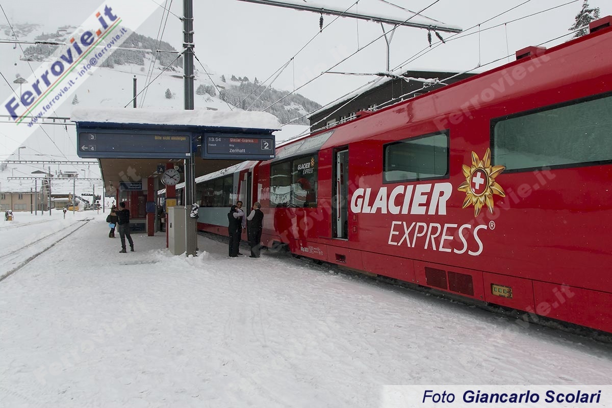 Il Glacier Express si ferma nel posto di movimento di Gehren dove incrociamo un treno con auto al seguito diretto a Realp. Siamo ora nel Vallese, ad Oberwald sono molte le auto in attesa del treno, anche per la chiusura del San Gottardo. Siamo nella valle del Rodano, qui il sole ci accompagna: con il treno affianchiamo numerose piste da sci di fondo, e qualche sciatore che ci guarda con curiosità.