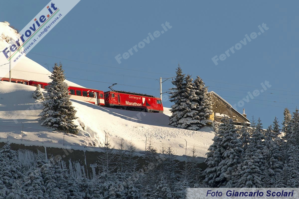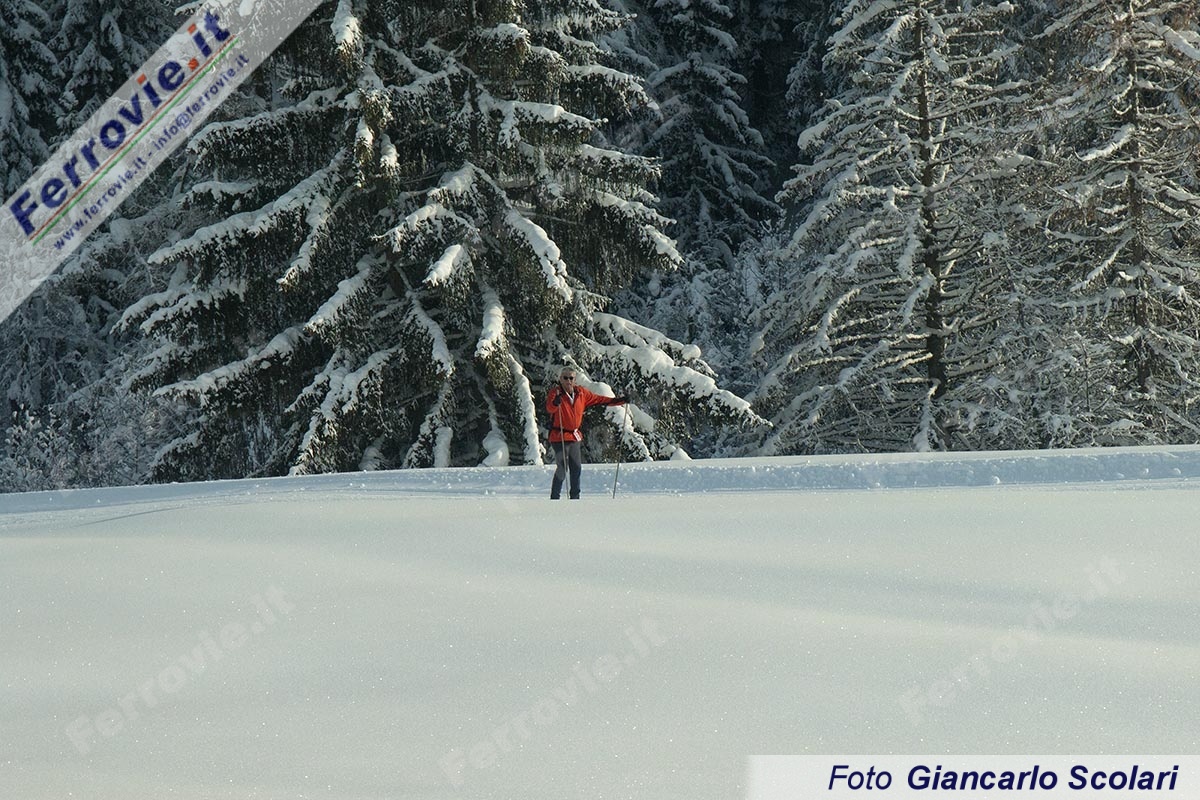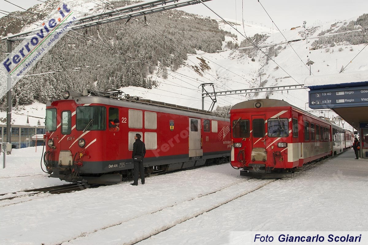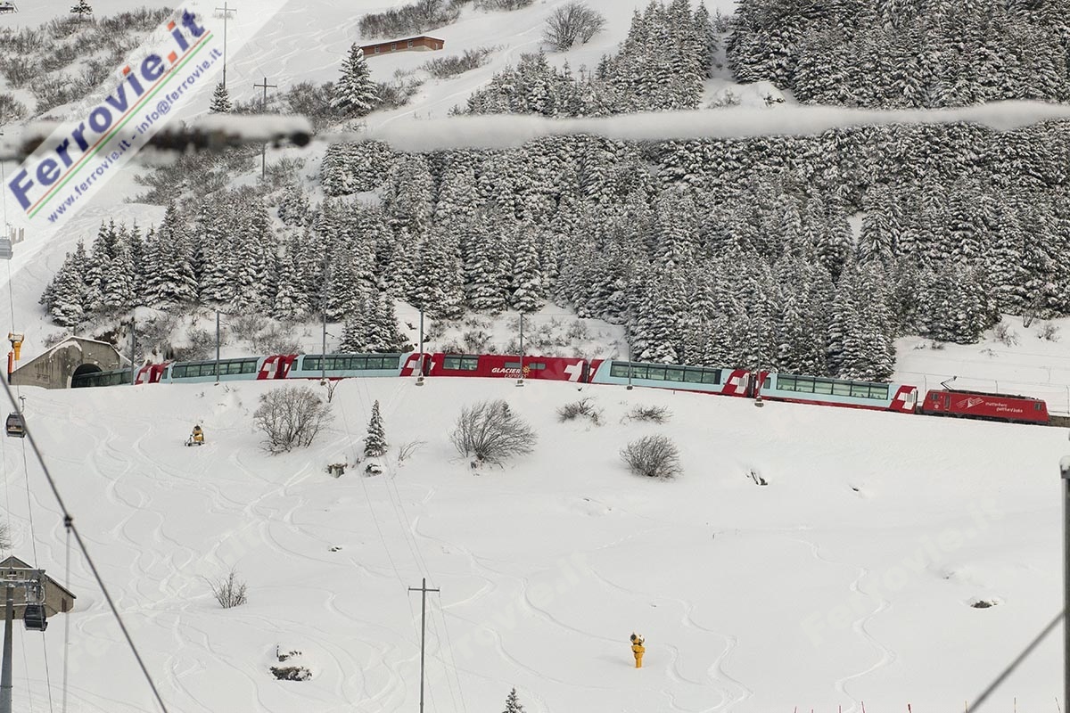 Il Glacier Express si ferma nel posto di movimento di Gehren dove incrociamo un treno con auto al seguito diretto a Realp. Siamo ora nel Vallese, ad Oberwald sono molte le auto in attesa del treno, anche per la chiusura del San Gottardo. Siamo nella valle del Rodano, qui il sole ci accompagna: con il treno affianchiamo numerose piste da sci di fondo, e qualche sciatore che ci guarda con curiosità.