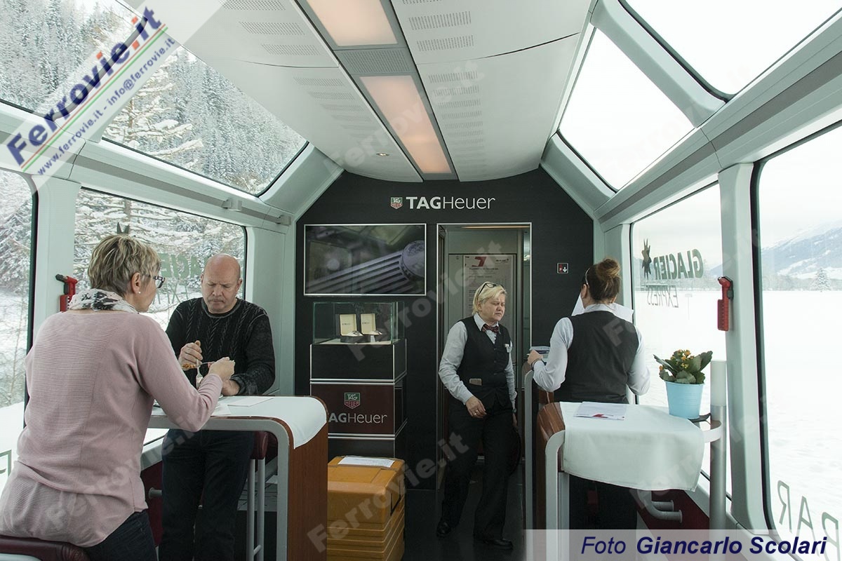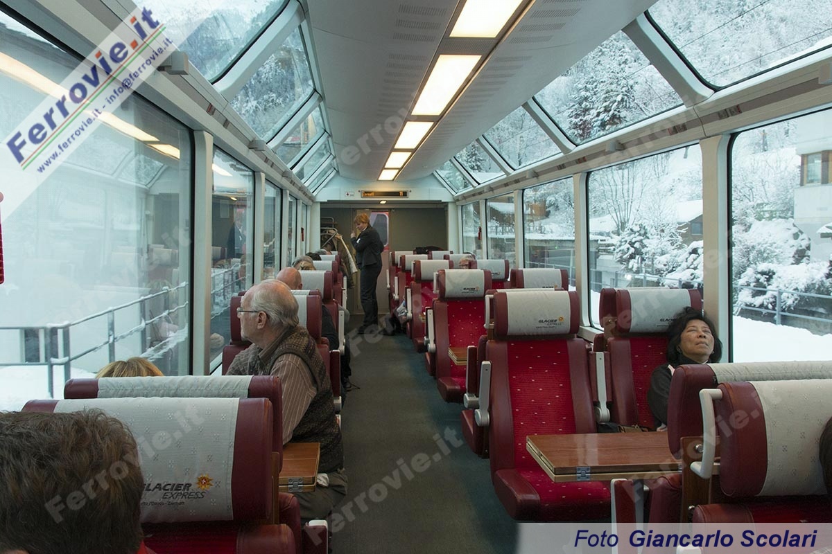 A colpire subito il viaggiatore le ampie vetrate dei finestrini che arrivano fino al soffitto permettendo così di apprezzare in pieno il panorama fantastico che andremo ad incontrare. Purtroppo non è possibile abbassare i finestrini, questo penalizza gli amanti della fotografia. Le vetture in prima classe hanno il classico modulo 2+1, hanno una seduta relativamente comoda (si potrebbe fare di meglio) e un arredamento abbastanza essenziale. Purtroppo non sono disponibili le prese di corrente al posto, difficile arrivare a fine viaggio con il telefonino ancora carico. Apprezziamo molto il vano per i bagagli e l'appendiabiti.