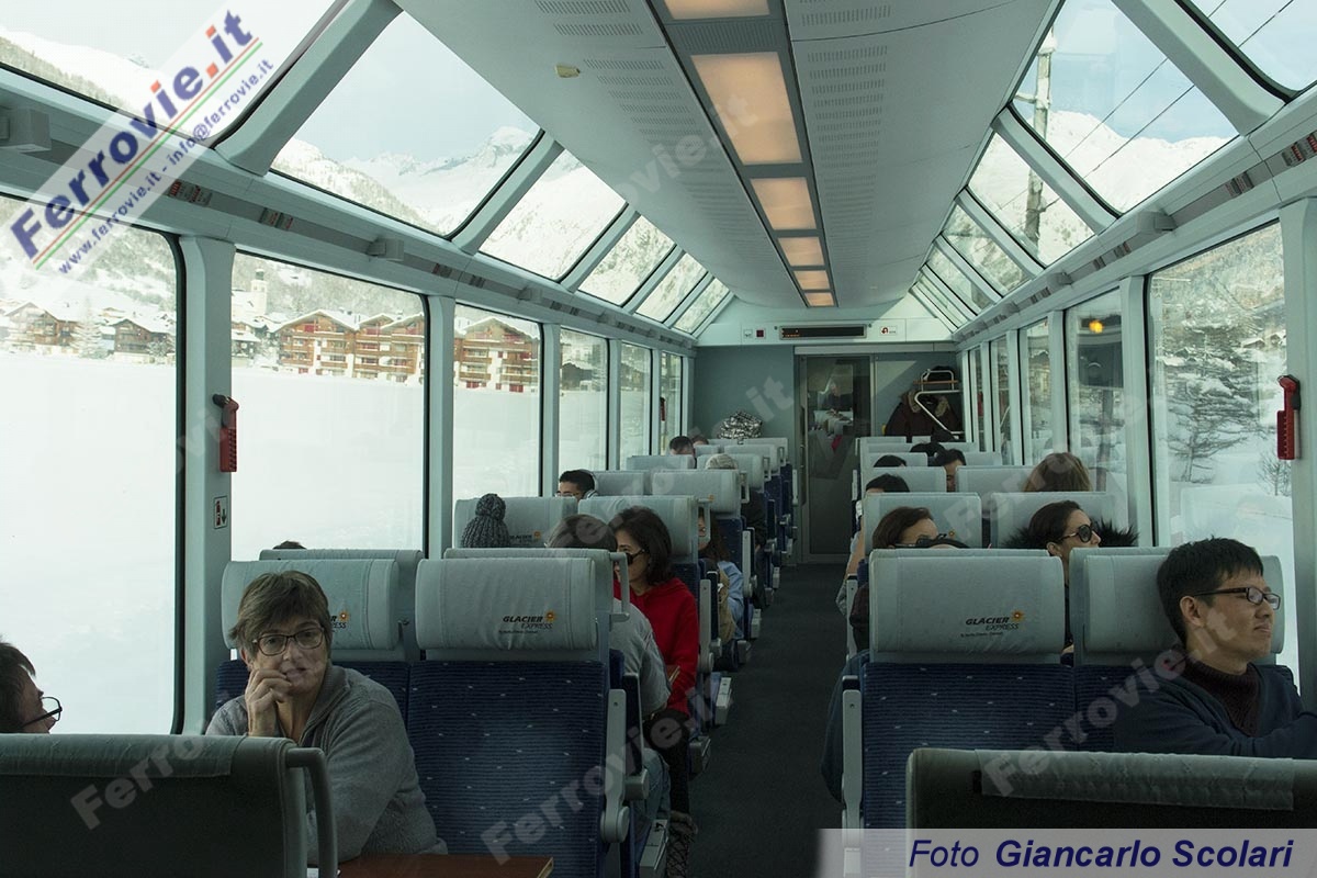 Sono le 15.40, il sole è ormai scomparso dietro le montagne, mancano 90 minuti al termine del lungo viaggio del Glacier Express. Ne approfittiamo per prendere una bibita, questa volta optiamo per un succo di mela, e fare un giro sul treno, mentre si riparte alla volta di Visp costeggiando la linea FFS del Rodano. E possiamo testimoniare "l'internazionalità" dei viaggiatori presenti a bordo: passando per i vagoni vediamo tratti somatici di tutto il mondo e ascoltiamo linguaggi diversi. A Visp cominciamo la lunga salita verso Zermatt, la neve a terra nella stretta valle aumenta e, nonostante le molte ore di viaggio, i passeggeri restano con il viso attaccato al vetro del finestrino per ammirare il paesaggio.