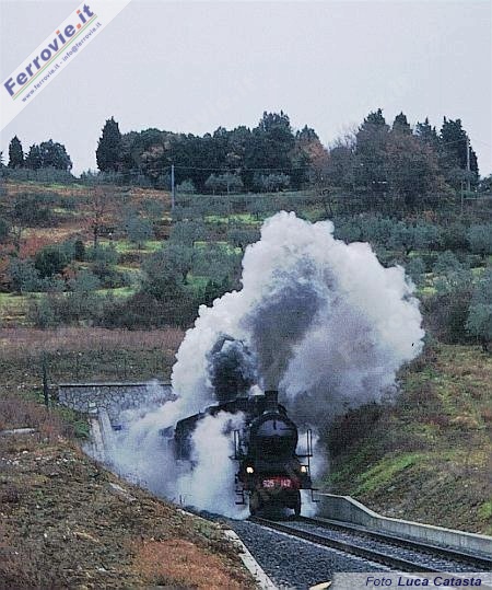 Finalmente il convoglio sbuca arrancando dalla galleria a velocità ridotta: il fumo emesso dalla 625.142 di Firenze e dalla 740.143 di Bologna C., titolari del convoglio, rimane a lungo nell'aria e continua ad uscire dalla galleria stessa.