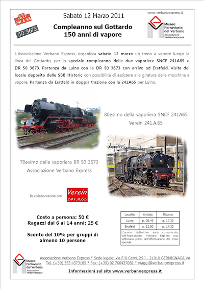 LUINO (Varese) - Verbano Express, organizza sabato 12 marzo un treno a vapore lungo la linea del Gottardo, per lo speciale compleanno delle due vaporiere SNCF 241A65 (80esimo anno di attività) e DR 50 3673 (70esimo). Partenza da Luino con la DR 50 3673 con arrivo ad Erstfeld. Visita del locale deposito delle SBB Historic con possibilità di assistere alla giratura della macchina a vapore. Partenza da Erstfeld in doppia trazione con la 241A65 per Luino.