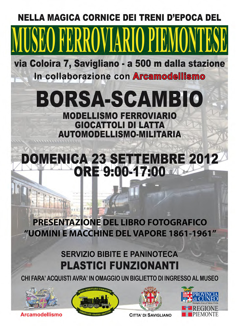 Il Museo Ferroviario Piemontese organizza in collaborazione con l'associazione Arcamodellismo-Torino un MERCATINO - BORSA - SCAMBIO di modellismo ferroviario, giocattoli di latta, automodellismo, militaria, domenica 23 settembre 2012 dalle ore 9,00 alle ore 17.00, nella stupenda cornice dei veri treni d'epoca della sede di Savigliano del Museo Ferroviario Piemontese, in via Coloira 7, a 500 metri dalla stazione.