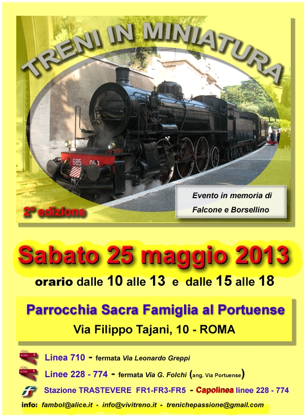 Sabato 25 maggio nei locali della Parrocchia Sacra Famiglia di Roma si terrà la seconda edizione di "Treni in miniatura". Dettagli in locandina.