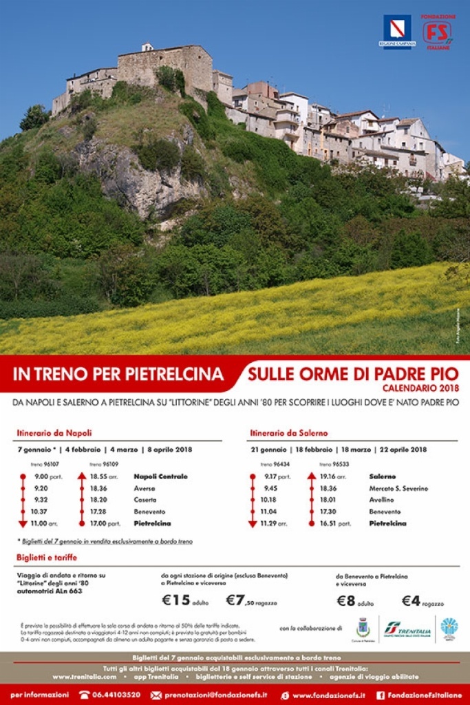Fondazione FS e Regione Campania confermano anche per il 2018 l'offerta di treni turistici che prevede due corse mensili per Pietrelcina, con partenze da Napoli Centrale e Salerno.
