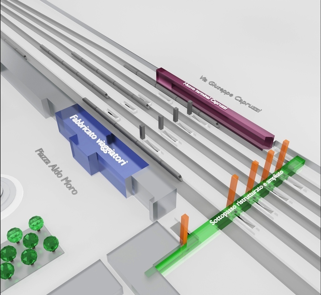 L'attuale sottopasso giallo sarà demolito. Al suo posto sarà realizzato un nuovo sottopasso di larghezza doppia, dotato di scale mobili di collegamento a Piazza Aldo Moro e Via Capruzzi e di ascensori a servizio dei binari. Termine lavori: primo semestre 2019.