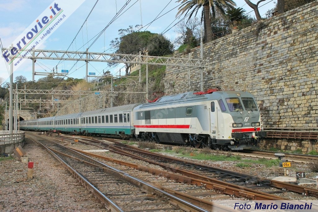 VENTIMIGLIA - Prima presenza della E.401.022 a Ventimiglia. Nei giorni 6 e 7 febbraio un treno prova composto dalla pilota 50 83 80-98 131 nei nuovi colori IC, sei vetture UIC-Z in livrea XMPR e la locomotiva E.401.022 hanno compiuto un andata e ritorno tra Roma e Ventimiglia, per testare le nuove locomotive elettriche ed il telecomando della carrozza pilota di nuova serie sotto la tensione di 1,5 kV presente nella stazione di confine.