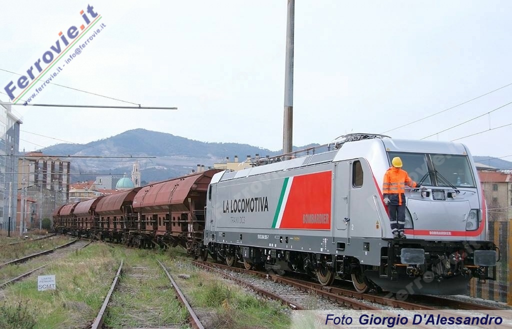 VADO LIGURE (Savona) - Prime immagini della nuova E 494.505, che nella mattinata del 21 marzo è uscita dallo stabilimento Bombardier di Vado Ligure. Si tratta della prima TRAXX DC3 attrezzata con "Last Mile", modulo Diesel che consente alla locomotiva di viaggiare in autonomia per brevi tratti su raccordi e linee non elettrificate, per manovrare in autonomia senza ricorso a locomotive Diesel.