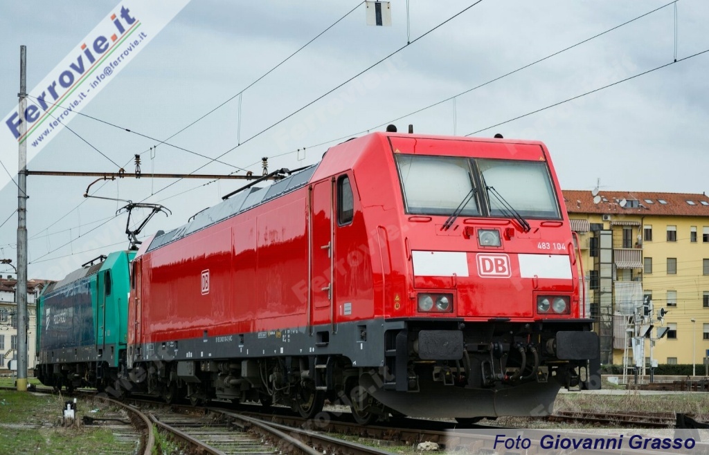 Dopo la manovra di uscita dalla rimessa di Asti, la E 483.104 è subito partita alla volta di Torino Orbassano trainata dalla E 483.009 di DB Cargo e quindi Chiasso.