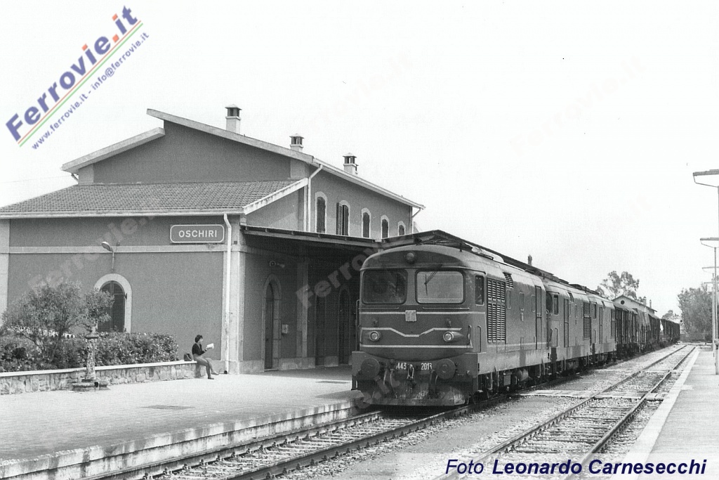 2. Alle locomotive D.443.2018, 2019 e 2016 è affidato il merci Golfo Aranci - Oristano, fermo nella stazione di Oschiri. (Foto Leonardo Carnesecchi, 23 maggio 1992)