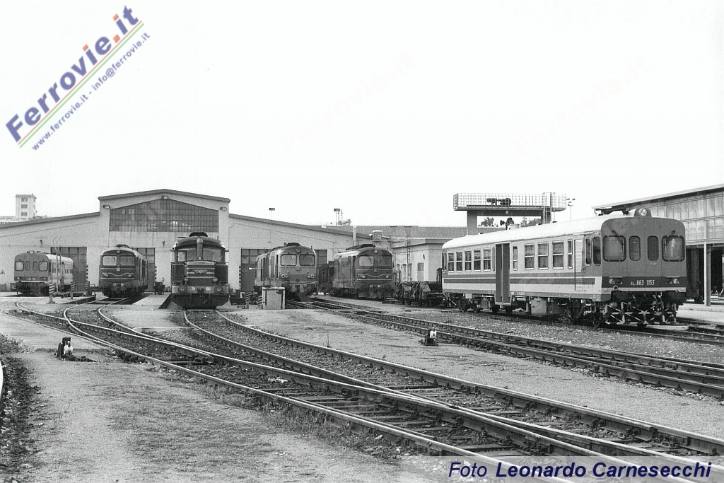 5. Ben altro affollamento di mezzi eterogenei nel Deposito Locomotive di Cagliari, dove prevalgono le automotrici ALn 663 e locomotive da treno dei gruppi D.443 e D.445. (Foto Leonardo Carnesecchi, 25 maggio 1992)