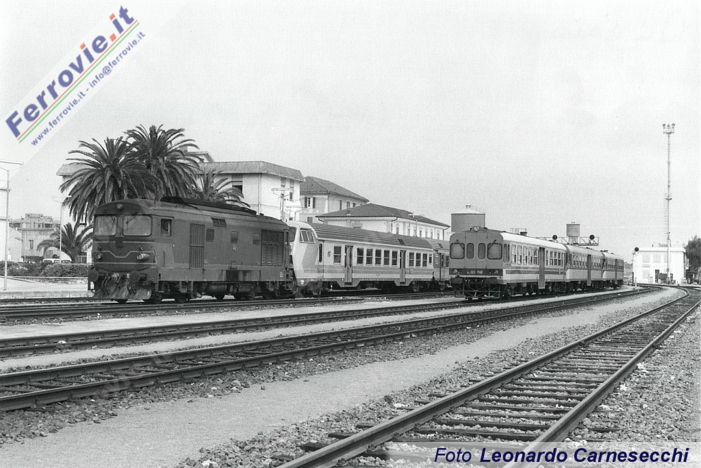 7. Composizione eterogenea per il locale Oristano Cagliari con una pilota per Medie Distanze TD e subito dietro una Medie Distanze con Vestiboli d'Estremità. In primo piano le ALn 663.1148,3219 e 3220 sostano in attesa del prossimo servizio. (Foto Leonardo Carnesecchi, 25 maggio 1992)
