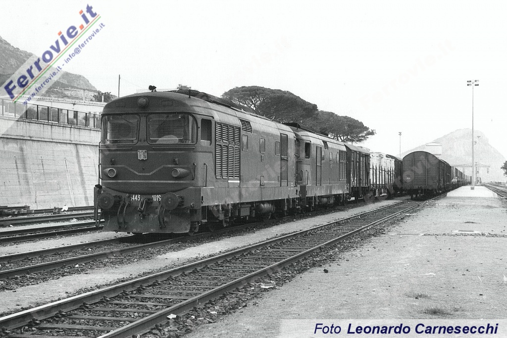 9. La D.443.1019 con i vetri frontali allo stato d'origine con la "sorella" 1021 sono pronti a partire da Golfo Aranci verso Cagliari, con una teoria di carri appena sbarcati dal traghetto in arrivo dal Continente. (Foto Leonardo Carnesecchi, 29 maggio 1992)