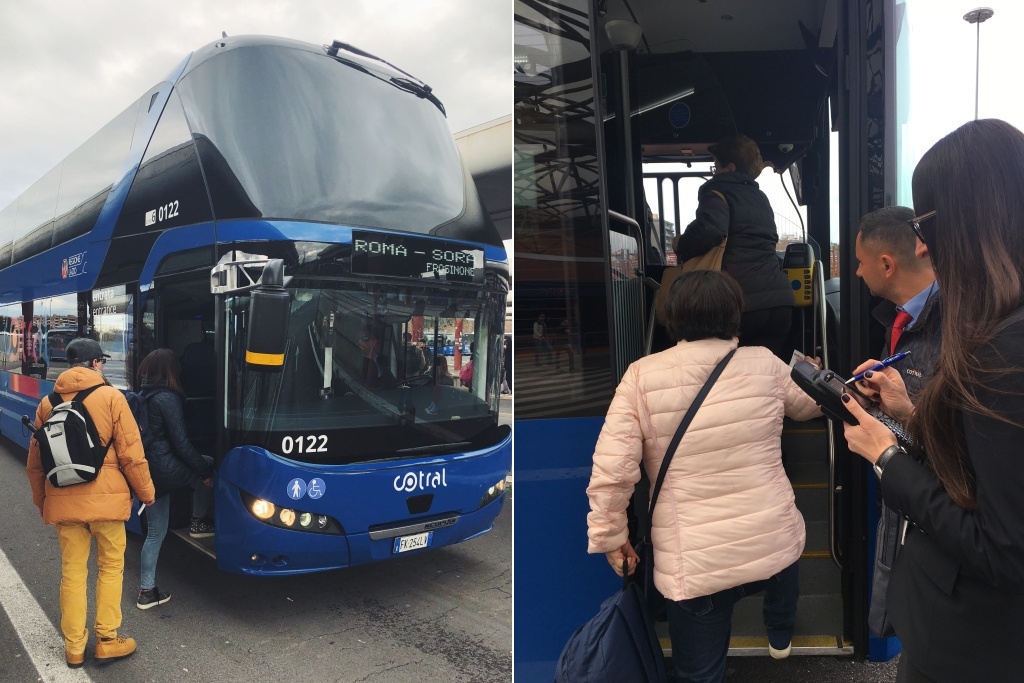 Si sale solo dalla porta anteriore con il biglietto o l'abbonamento a portata di mano, pronto per essere convalidato e mostrato all'autista: è partito il 9 aprile il controllo a vista dei titoli di viaggio da parte del conducente su circa mille corse di linea Cotral. La sperimentazione durerà sei mesi su linee a bassa frequentazione in tutto il territorio del Lazio per poi essere progressivamente estesa alle corse anche in orario di punta. Nella prima fase gli autisti saranno affiancati da squadre di verifica a bordo dei bus e da personale Cotral sulle banchine nei principali nodi di scambio. La campagna di comunicazione "Miglioriamo Insieme", partita lo scorso mese di marzo, ha invece l'obiettivo di sensibilizzare i clienti su alcune buone pratiche per evitare che si formino code in salita sui mezzi alle fermate e ai capolinea: un adesivo avverte i passeggeri che non è consentita la salita dalla porta posteriore, all'interno, sulla fiancata e sul retro dei mezzi penduli e pellicole veicolano il messaggio.