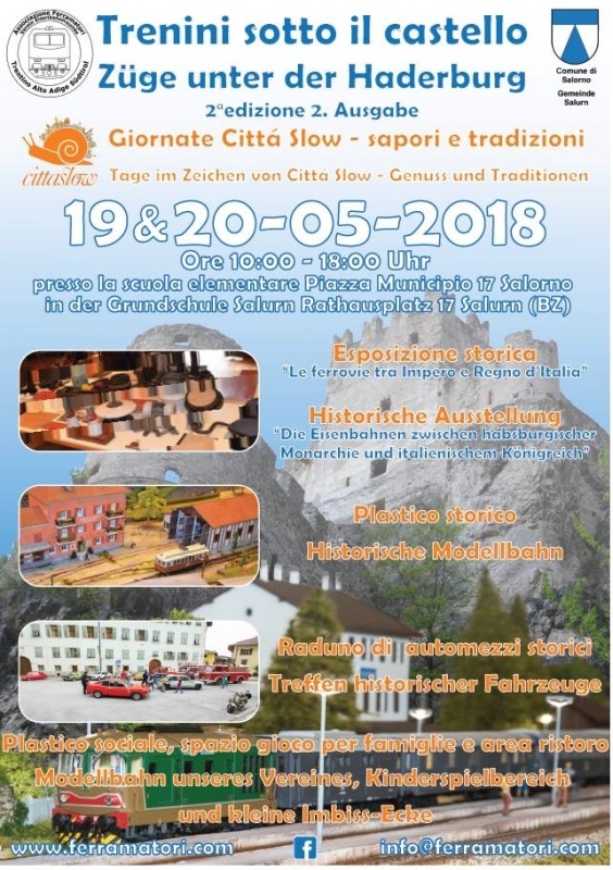 In concomitanza con la prima giornata "Città Slow - sapori e tradizioni" a Salorno (BZ), l'Associazione Ferramatori Trentino Alto Adige (AFTAA) organizza la seconda edizione di TRENINI SOTTO IL CASTELLO! Sabato 19 e domenica 20 maggio con orario 10-18 presso le scuole elementari di Salorno in Piazza Municipio sarà esposto il plastico sociale completamente rinnovato; l'evento sarà impreziosito da una ricca esposizione di modelli ferroviari e di cimeli storici, oltre che dalla presenza di mezzi gommati storici e di un mercatino modellistico.