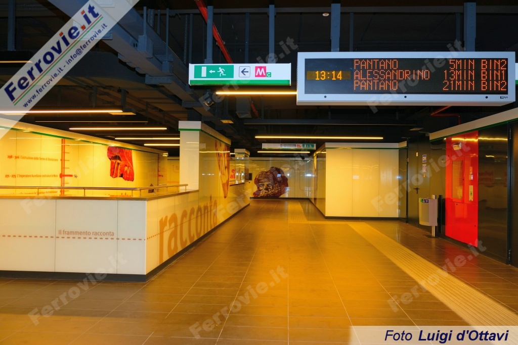 La realizzazione ha richiesto diverse varianti rispetto all'originaria progettazione, sia per vincoli archeologici che per disposizioni in materia di sicurezza dei passeggeri. Originariamente, infatti, il passaggio della nuova linea sarebbe dovuto avvenire sopra i binari della linea A ed era previsto un raccordo per consentire il trasferimento del materiale rotabile; successivamente, al fine di preservare i numerosi ritrovamenti, si è deciso di procedere sotto lo strato archeologico e realizzare un attraversamento tra le due linee che ha richiesto di soddisfare le nuove prescrizioni in materia di sicurezza, rinviando il collegamento diretto tra le banchine all'ammodernamento della stazione della linea A.