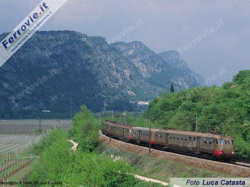 Convoglio di ALe 840 con la 026 in coda, ripreso sul curvone di Ceraino (VR) poco prima della stazione, impegnato con un treno regionale Verona - Bolzano. Questo tratto di linea è stato soppresso nel novembre '98, con l'entrata in servizio della galleria che da Domegliara sbuca poco prima della stazione di Dolcè. (Foto Luca Catasta, 2 maggio 1998)