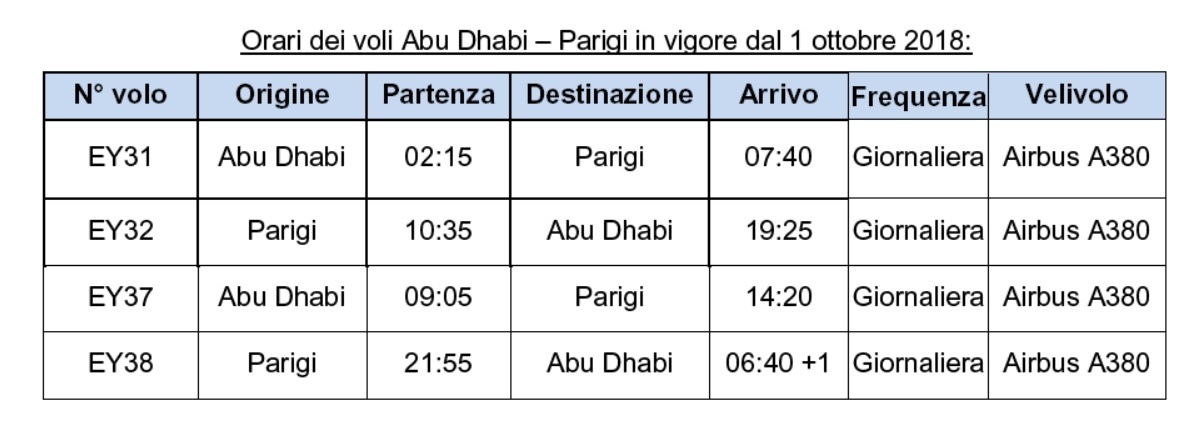A partire dal 1° ottobre 2018 Etihad Airways opererà il secondo volo giornaliero che collega Abu Dhabi e Parigi Charles de Gaulle con un Airbus A380, che diverrà l'unico velivolo operativo su questa rotta. L'aeroporto di Parigi Charles de Gaulle diventa così la seconda destinazione europea, dopo Londra Heathrow, a offrire agli ospiti di Etihad Airways due collegamenti al giorno con il pluripremiato aereo.