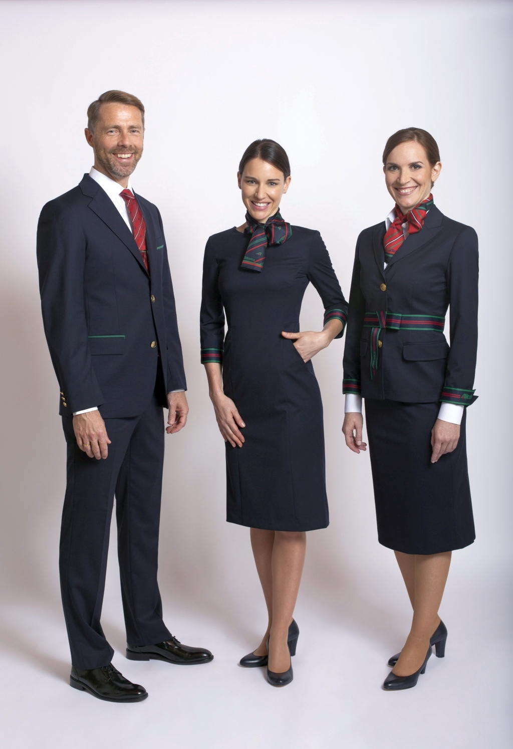 Il look include camicie in popeline di cotone con taschino, foulard e cravatte coordinate in twill di seta, guanti in pelle e maglieria in pura lana. Per il servizio di bordo sono stati infine disegnati un gilet e un abito-grembiule in tessuto jacquard logato Alitalia.