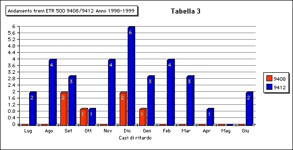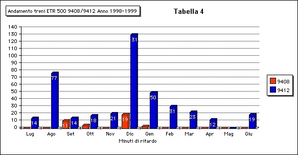 Grazie ai dati comparativi si evidenziano gli andamenti semestrali dei treni del Trasporto Locale per casi d'avaria e minuti di ritardo nel corso del biennio 96/98 e primo semestre 1999, insieme ad un resoconto per avarie e perditempo degli ES 9408 e 9412 relativo all'anno 1998 ed al primo semestre 1999.
