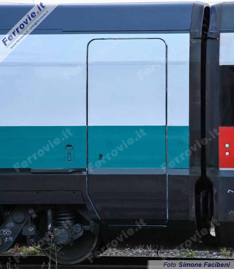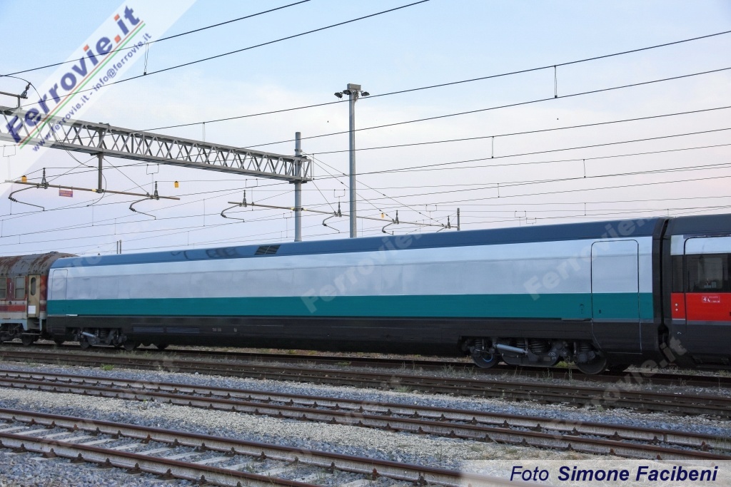 FIRENZE - E' giunta a Firenze Castello, nel pomeriggio del 20 agosto, la prima carrozza per ETR.500 trasformata per i futuri servizi Mercitalia Fast (vedi News ferroviarie del 23/02/2018 e News ferroviarie del 06/04/2018 ), per il trasporto ad alta velocità di collettame, posta, ecc. Il veicolo si presenta nella nuova coloritura che dovrebbe essere adottata per l'intero convoglio, con base del telaio grigio, fascia verde di analoga altezza della fascia rossa dei Frecciarossa, ed ampia fascia bianca che arriva fin sopra alla base del tetto ricoprendo i finestrini.