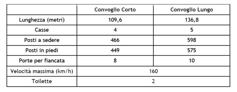 Si tratta di convogli a doppio piano, bidirezionali, a composizione bloccata, a trazione elettrica 3 kV e potenza distribuita. Questi i principali numeri.