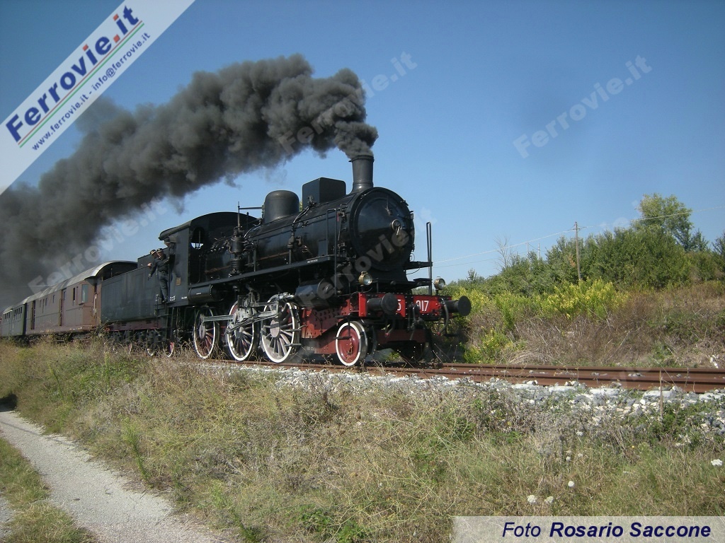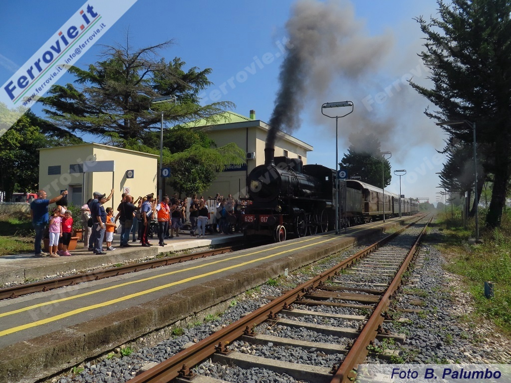 SANTA CROCE DEL SANNIO (Benevento) - Treno storico speciale in occasione del cinquantesimo anniversario della scomparsa di San Pio nelle sue terre di origine. Domenica 23 settembre Fondazione FS ha organizzato un treno speciale da Salerno a Pietrelcina, paese natale di San Pio e da qui fino a Santa Croce del Sannio, dove si è svolta anche una piccola cerimonia per festeggiare la riapertura della stazione propedeutica alla futura riattivazione dell'intera ferrovia Benevento-Campobasso. La trazione del treno è stata affidata alla locomotiva diesel D.345.1142 tra Salerno e Benevento ed alla vaporiera 625.017 tra Benevento e Santa Croce; in composizione due carrozze Centoporte (CIz 36909 e Cz37071), due carrozze Corbellini (Bz38599 e ABz38603, quest'ultima in grigio ardesia) ed il bagagliaio Dz83031 appositamente attrezzato per il trasporto di disabili in carrozzina; il locomotore diesel è comunque rimasto di supporto in composizione al treno. La vaporiera è giunta a Caserta nel tardo pomeriggio di sabato 22 settembre proveniente da Roma trainata dalla E.655.417 attirando l'attenzione di coloro che passavano lungo le strade adiacenti la ferrovia poiché la colonna di fumo era ben visibile anche a distanza dal viale Carlo III: nessuno ha voluto rinunciare ad una foto o ad un selfie creando così anche un po' di perturbazione nel traffico cittadino. La locomotiva ha poi proseguito per Benevento dove è stata ospitata nel locale deposito per tutta la notte e di buon mattino era già pronta in primo binario in attesa che da Salerno giungesse il convoglio storico da trainare. Dopo i discorsi di rito delle autorità e la benedizione del vescovo di Benevento, la vaporiera è stata agganciata in testa al treno ed alle 11.15 ha così iniziato il suo viaggio alla volta della piccola stazione di Pietrelcina.
