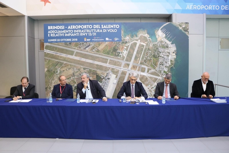 Si è tenuta questa mattina la cerimonia di avvio dei lavori di adeguamento delle infrastrutture di volo e degli impianti della pista 13/31 dell'aeroporto del Salento di Brindisi. Alla manifestazione sono intervenuti il Presidente della Regione Puglia, Michele Emiliano, il Direttore Generale dell'ENAC, Alessio Quaranta, il Presidente di Aeroporti di Puglia, Tiziano Onesti, il Vice Presidente, Antonio Vasile, la Consigliera di Amministrazione Beatrice Lucarella, il Sindaco di Brindisi, Riccardo Rossi, il Presidente dell'Autorità di Sistema Portuale dell'Adriatico Meridionale, Ugo Patroni Griffi, i Rappresentanti delle Autorità Civili e Militari.