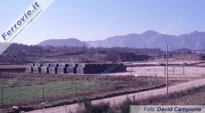 1. Presso San Vittore (FR) un'area opportunamente recintata è stata adibita a deposito del materiale necessario ad armare la linea. (Foto David Campione, 08 febbraio 1997)