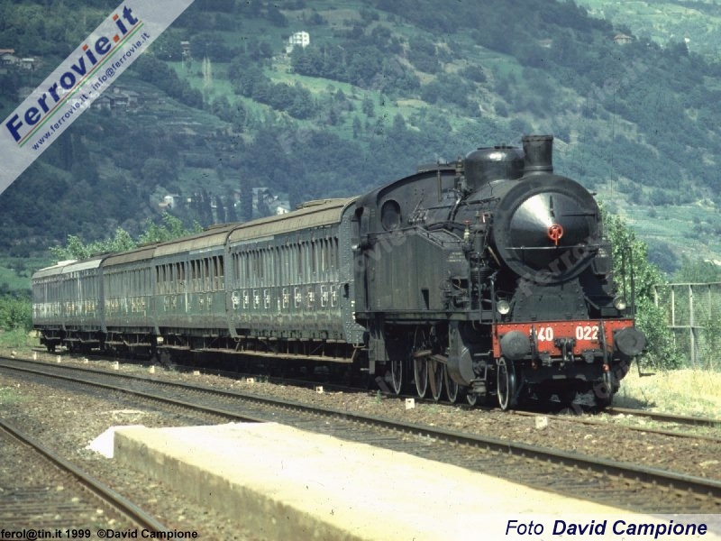Durante i festeggiamenti per il centenario delle ferrovie in Val d'Aosta, sono stati effettuati numerosi treni speciali con trazione a vapore. Nella foto uno di questi in sosta nella stazione di Nus, in attesa di ripartire per Aosta con in testa la 940.022. (Foto David Campione, 4 luglio 1986)
