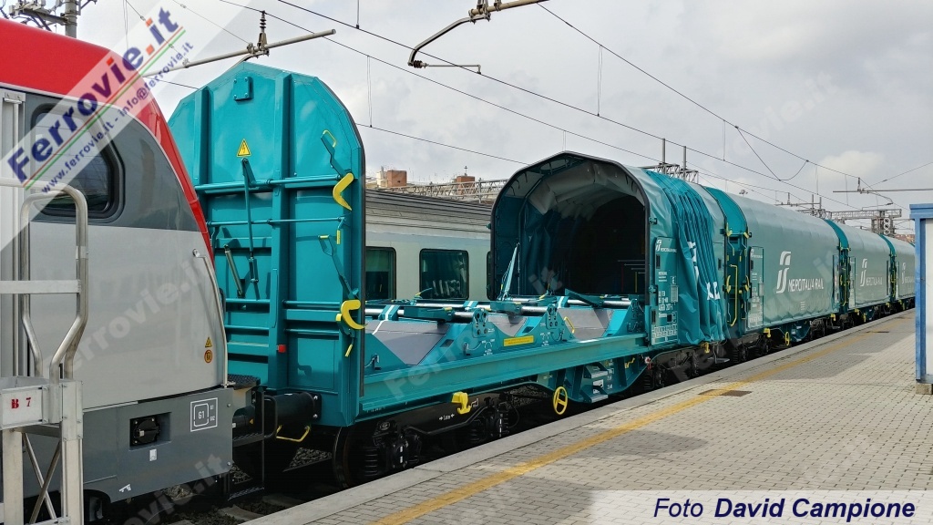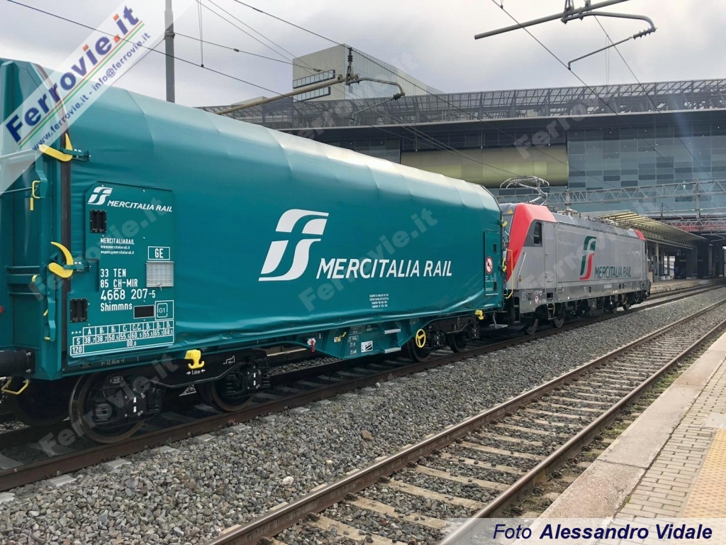 Insieme alla E 494.003 a Roma Tiburtina sono stati presentati anche alcuni carri Shimmns per il trasporto di coils, appartenenti all'ultima fornitura di 200 unità e costruiti da Greenbrier per Mercitalia Rail (vedi News ferroviarie del 12/05/2017 e News ferroviarie del 15/11/2017).