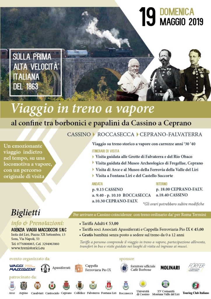 Un'avventura per famiglie, curiosi ed appassionati, ma anche per coloro che desiderano avvicinarsi alla conoscenza di un territorio poco conosciuto ma ricco di incredibili tesori culturali. Domenica 19 maggio 2019 lo speciale convoglio partirà dalla stazione di Cassino, alle ore 9.15, e percorrerà la linea della prima ferrovia ad alta velocità d'Italia con destinazione Ceprano-Falvaterra (FR), stazione di confine tra lo Stato Pontificio e il Regno dei Borboni.