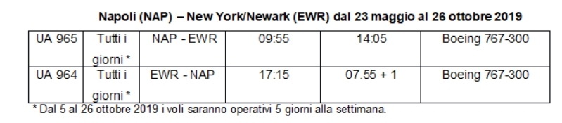 United Airlines ha annunciato l'introduzione di un nuovo servizio stagionale di voli giornalieri diretti tra l'Aeroporto Internazionale di Napoli e il suo hub a New York/Newark. I voli saranno operativi fino al 26 ottobre 2019.