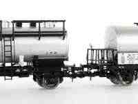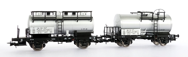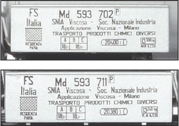 | Descrizione: | Set 2 carri cisterna a 2 assi "SNIA" con differenti cisterne, per trasporto prodotti chimici |