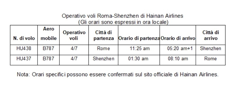 Il volo di ritorno HU437, invece, partirà dall'aeroporto internazionale di Shenzhen-Bao'an, all'1:30 del mattino, ed arriverà all'aeroporto internazionale di Roma-Fiumicino alle 8:10 locali, dello stesso giorno.