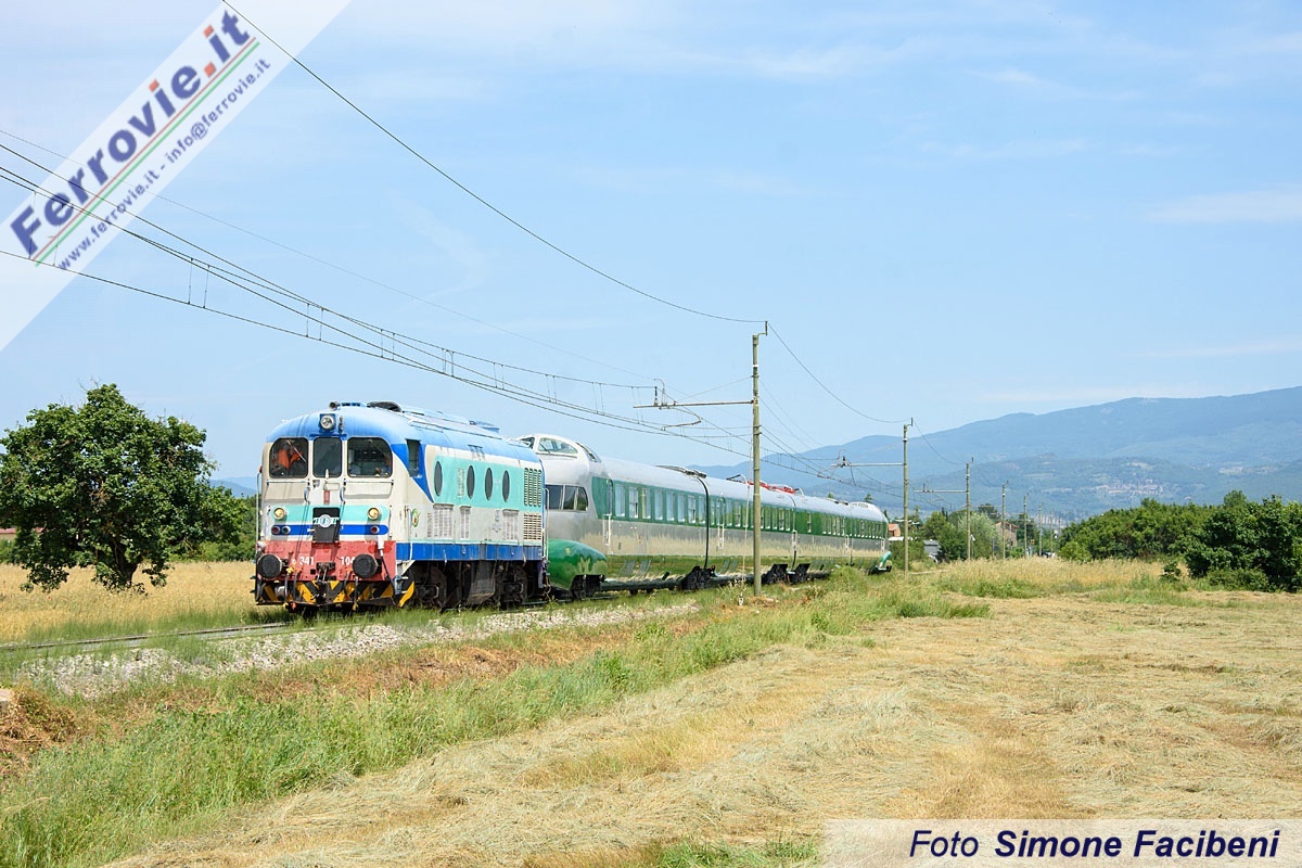 PORRENA (Arezzo) - Venerdì 21 giugno 2019, in concomitanza con l'inizio dell'estate astronomica, è stato riconsegnato a Fondazione FS lo storico ETR.252 "Arlecchino", dopo un lavoro di restauro e revisione durato in tutto 38 mesi presso l'Officina Metalmeccanica Specializzata di Porrena. Il trasferimento sulla rete TFT da Porrena ad Arezzo RFI dell'"Arlecchino" è stato svolto utilizzando l'altrettanto ultracinquantenne D.341.1041 di TFT, ceduta dalle FS all'impresa aretina nel lontano 1989 ed ancora prontamente utilizzata, insieme alla gemella 1063, per invii di materiale o eventuali sporadici servizi merci lungo la linea sociale. Una volta giunto ad Arezzo l'ETR.252 è stato inserito in composizione ad un trasferimento di materiale storico proveniente dalla Sardegna, giunto la notte precedente da Salerno, con destinazione il Deposito Rotabili Storici di Pistoia.