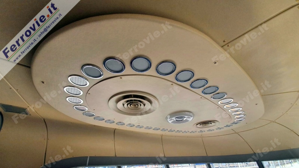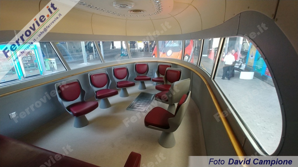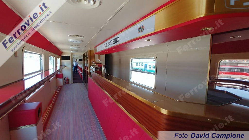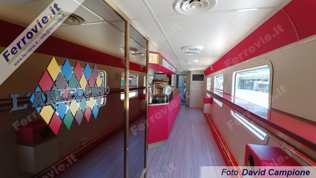 I due belvedere, peculiarità dell'Arlecchino e del Settebello, mantengono le 8 poltroncine girevoli e il divano da 3 posti sulla parete di fondo dell'ambiente.