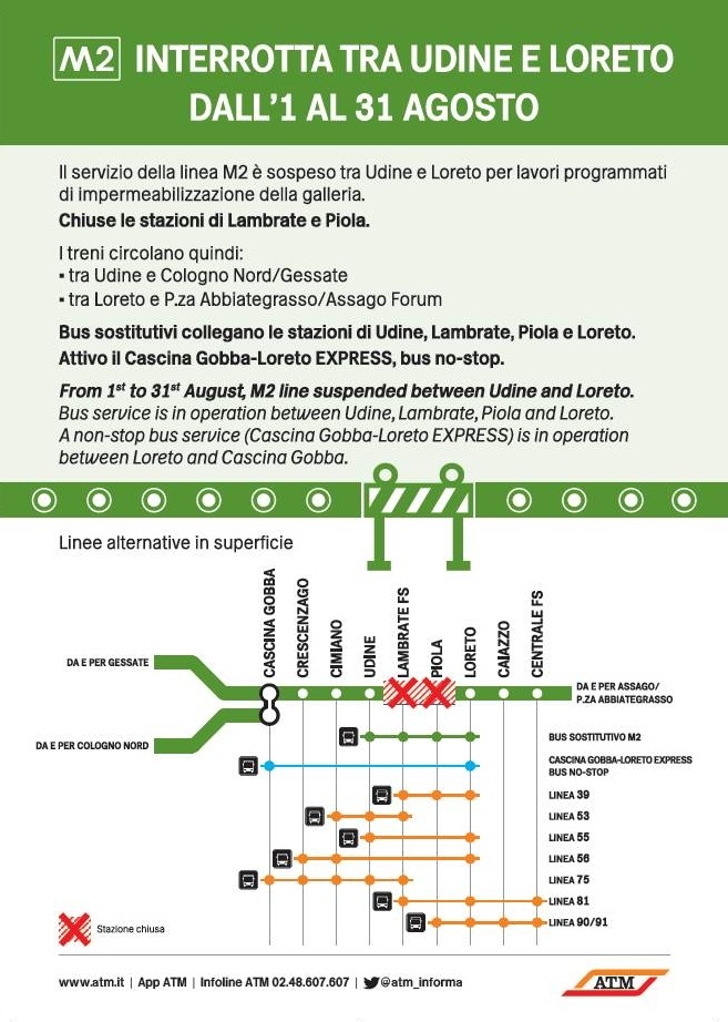 Tutte le info e i dettagli sono disponibili a questo link: http://www.atm.it/it/ViaggiaConNoi/InfoTraffico/Pagine/LavoriprogrammatisuM2lineainterrottaLoreto-Udineadagosto.aspx