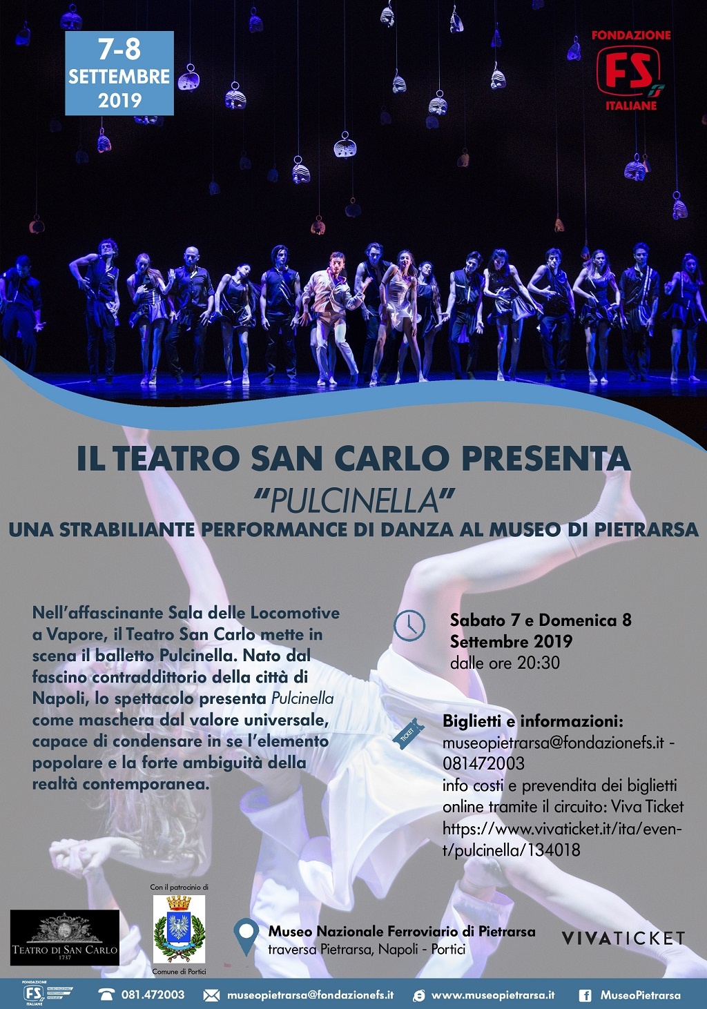 Sabato 7 e domenica 8 settembre il grande padiglione delle locomotive nel Museo Nazionale Ferroviario di Pietrarsa ospiterà il balletto "Pulcinella". La straordinaria performance artistica sarà eseguita in uno scenario inedito, tra antiche locomotive a vapore che faranno da insolita cornice all'esibizione.