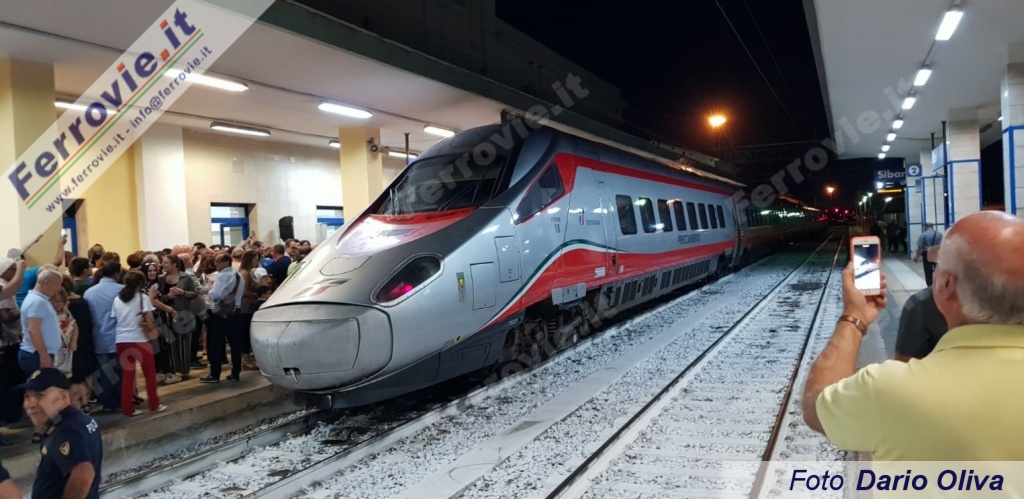 SIBARI (Cosenza) - Grande folla e grandi festeggiamenti a Sibari, la sera di domenica 15 settembre, per l'arrivo dell'ETR.600-01 di Trenitalia proveniente fuori servizio da Roma come IMV 15367. Cittadini, autorità e stampa hanno così accolto l'elettrotreno giunto nella città calabrese per l'effettuazione del primo Frecciargento Sibari - Bolzano. I festeggiamenti si sono quindi ripetuti all'alba di lunedì 16 settembre, con la partenza del primo treno diretto in Trentino-Alto Adige.