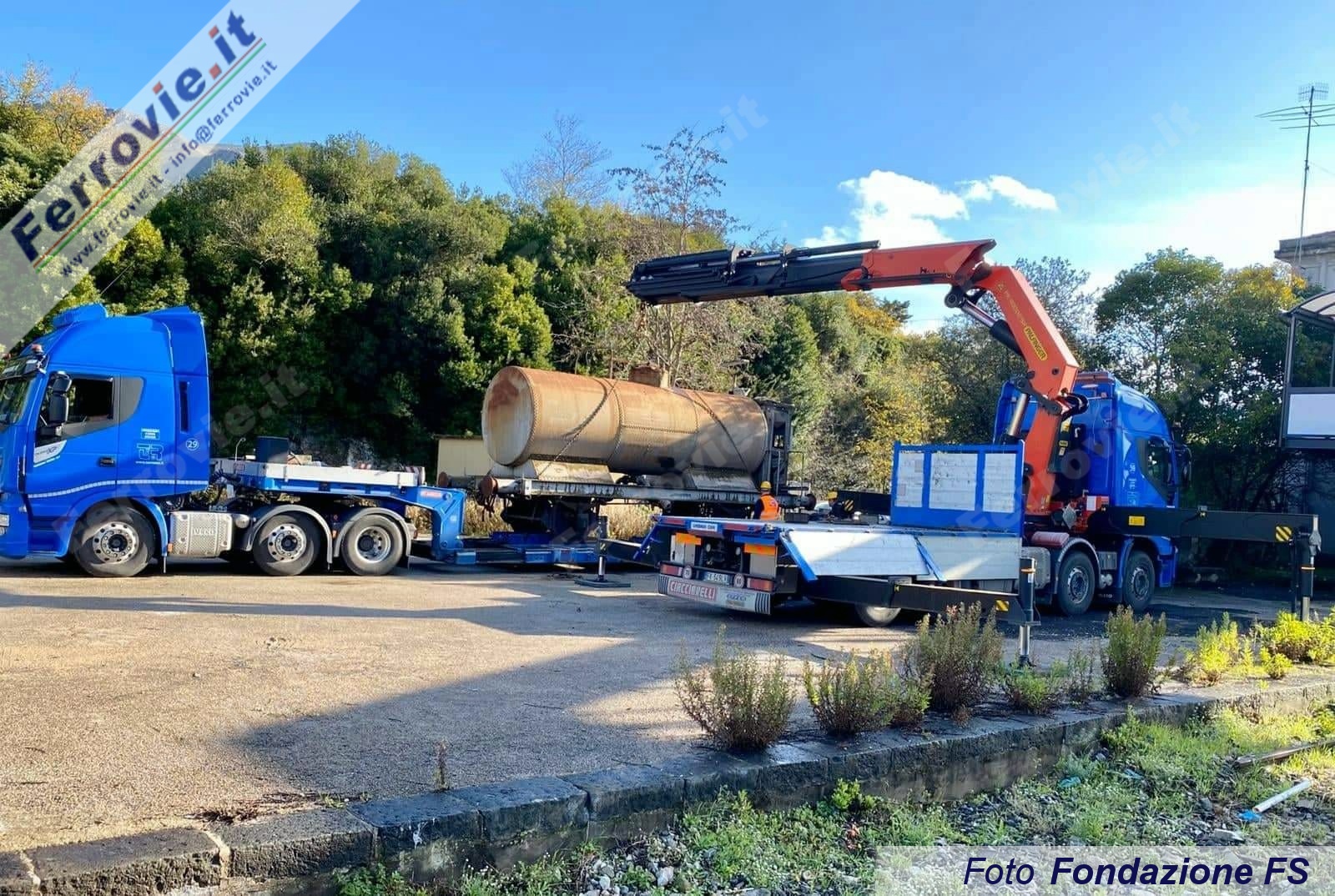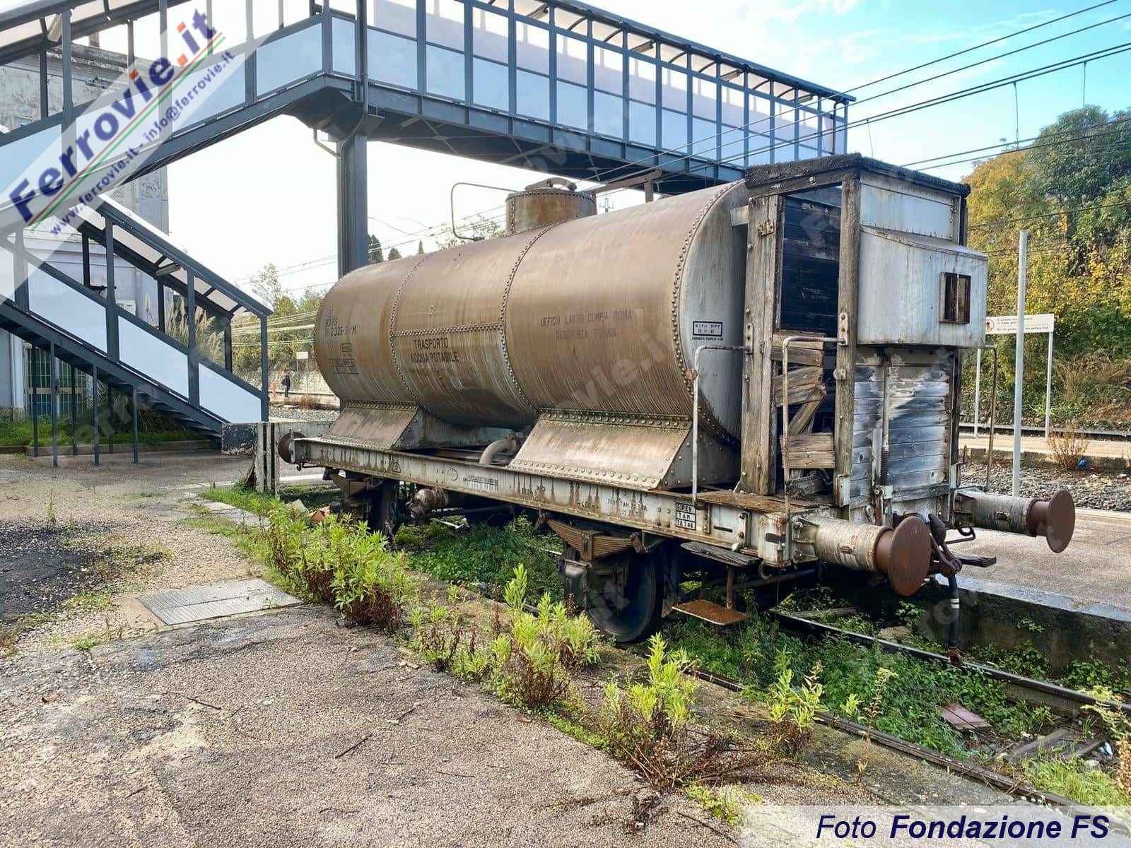 ITRI (Latina) - Dopo anni di accantonamento e di isolamento su un tronchino della stazione di Itri tagliato dal resto della rete ferroviaria nazionale, è stato avviato il recupero del carro cisterna VZk già segnalato da Ferrovie.it nel 2015 (vedi Treni storici del 15/03/2015).