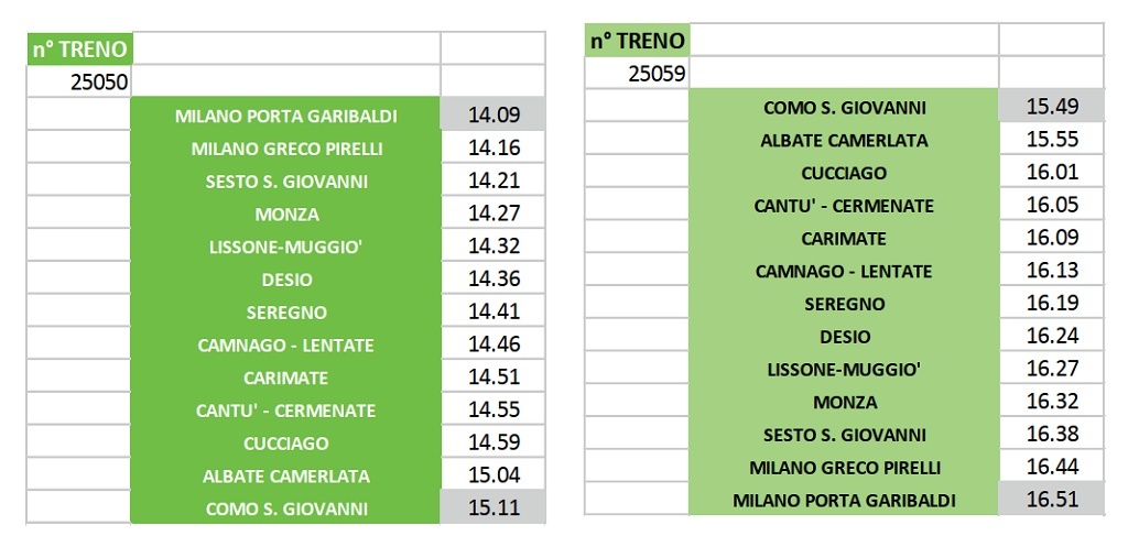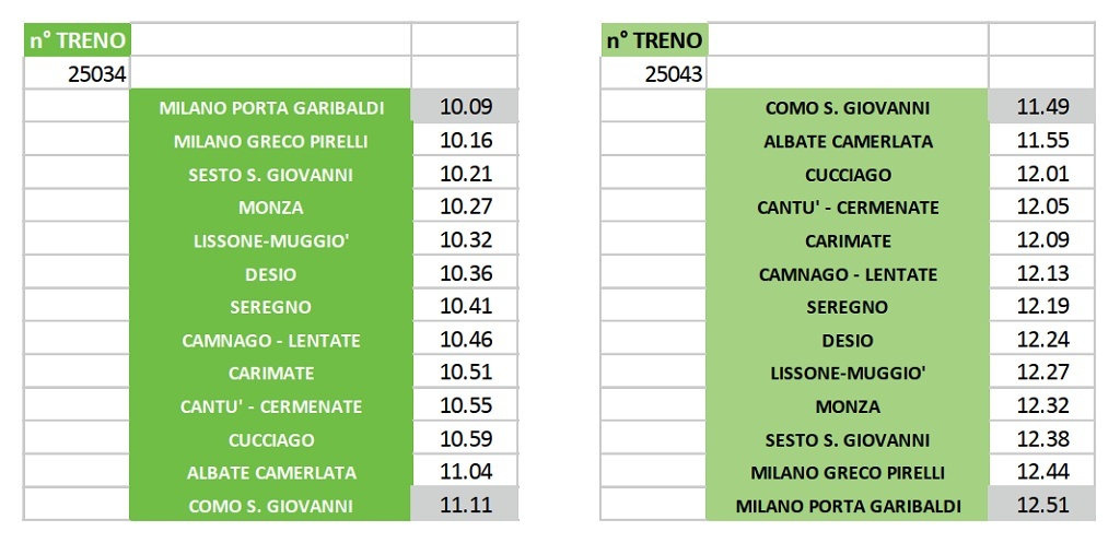 Il treno ripartirà poi da Como San Giovanni alle ore 11.49 con destinazione Milano Porta Garibaldi alle ore 12.51; nel pomeriggio è poi prevista una nuova corsa di andata e ritorno sempre sulla tratta Milano Porta Garibaldi - Como San Giovanni, con le medesime fermate. Le corse interessate saranno: